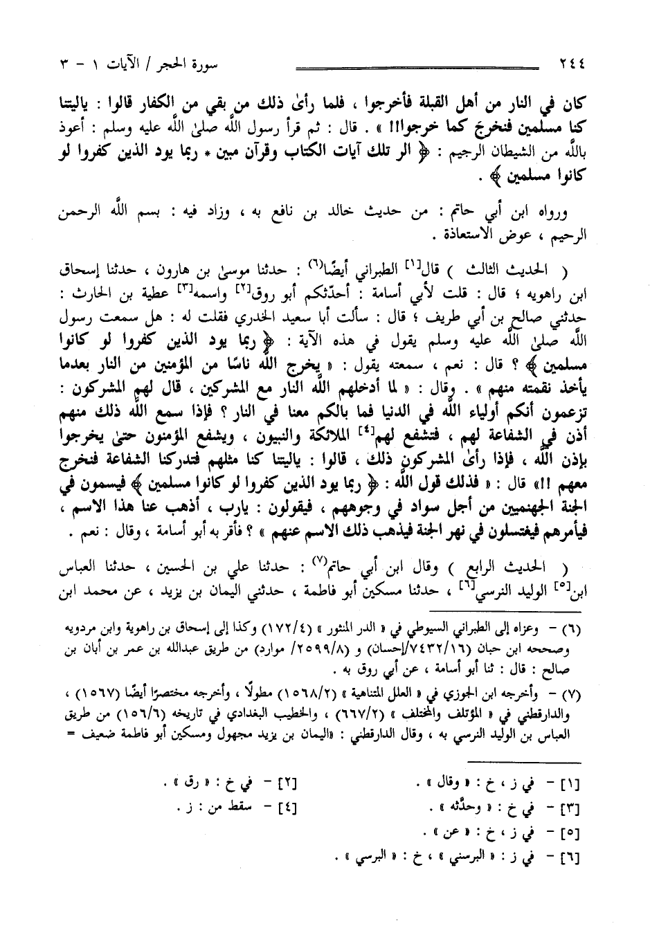 كَانَ فِي النَّار مِنْ أَهْل الْقِبْلَة فَأُخْرِجُوا فَلَمَّا رَأَى ذَلِكَ مَنْ بَقِيَ مِنْ الْكُفَّار قَالُوا يَا لَيْتَنَا كُنَّا مُسْلِمِينَ فَنَخْرُج كَمَا خَرَجُوا قَالَ ثُمَّ قَرَأَ رَسُول اللَّه صَلَّى اللَّه عَلَيْهِ وَسَلَّمَ أَعُوذ بِاَللَّهِ مِنْ الشَّيْطَان الرَّجِيم " الر تِلْكَ آيَات الْكِتَاب وَقُرْآن مُبِين رُبَمَا يَوَدّ الَّذِينَ كَفَرُوا لَوْ كَانُوا مُسْلِمِينَ " وَرَوَاهُ اِبْن أَبِي حَاتِم مِنْ حَدِيث خَالِد بْن نَافِع بِهِ وَزَادَ فِيهِ بِسْمِ اللَّه الرَّحْمَن الرَّحِيم عِوَض الِاسْتِعَاذَة " الْحَدِيث الثَّالِث " قَالَ الطَّبَرَانِيّ أَيْضًا حَدَّثَنَا مُوسَى بْن هَارُون حَدَّثَنَا إِسْحَاق بْن رَاهْوَيْهِ قَالَ : قُلْت لِأَبِي أُسَامَة أَحَدَّثَكُمْ أَبُو رَوْق وَاسْمه عَطِيَّة بْن الْحَارِث حَدَّثَنِي صَالِح بْن أَبِي شَرِيف قَالَ سَأَلْت أَبَا سَعِيد الْخُدْرِيّ فَقُلْت لَهُ هَلْ سَمِعْت رَسُول اللَّه صَلَّى اللَّه عَلَيْهِ وَسَلَّمَ يَقُول فِي هَذِهِ الْآيَة " رُبَمَا يَوَدّ الَّذِينَ كَفَرُوا لَوْ كَانُوا مُسْلِمِينَ " ؟ قَالَ نَعَمْ سَمِعْته يَقُول " يُخْرِج اللَّه نَاسًا مِنْ الْمُؤْمِنِينَ مِنْ النَّار بَعْدَمَا يَأْخُذ نِقْمَته مِنْهُمْ" وَقَالَ " لَمَّا أَدْخَلَهُمْ اللَّه النَّار مَعَ الْمُشْرِكِينَ قَالَ لَهُمْ الْمُشْرِكُونَ تَزْعُمُونَ أَنَّكُمْ أَوْلِيَاء اللَّه فِي الدُّنْيَا فَمَا بَالكُمْ مَعَنَا فِي النَّار ؟ فَإِذَا سَمِعَ اللَّه ذَلِكَ مِنْهُمْ أَذِنَ فِي الشَّفَاعَة لَهُمْ فَتَشْفَع لَهُمْ الْمَلَائِكَة وَالنَّبِيُّونَ وَيَشْفَع الْمُؤْمِنُونَ حَتَّى يَخْرُجُوا بِإِذْنِ اللَّه فَإِذَا رَأَى الْمُشْرِكُونَ ذَلِكَ قَالُوا يَا لَيْتَنَا كُنَّا مِثْلهمْ فَتُدْرِكنَا الشَّفَاعَة فَنَخْرُج مَعَهُمْ ; قَالَ فَذَلِكَ قَوْل اللَّه " رُبَمَا يَوَدّ الَّذِينَ كَفَرُوا لَوْ كَانُوا مُسْلِمِينَ " فَيُسَمَّونَ فِي الْجَنَّة الْجَهَنَّمِيِّينَ مِنْ أَجْل سَوَاد فِي وُجُوههمْ فَيَقُولُونَ يَا رَبّ أَذْهِبْ عَنَّا هَذَا الِاسْم فَيَأْمُرهُمْ فَيَغْتَسِلُونَ فِي نَهَر الْجَنَّة فَيَذْهَب ذَلِكَ الِاسْم عَنْهُمْ " فَأَقَرَّ بِهِ أَبُو أُسَامَة وَقَالَ نَعَمْ " الْحَدِيث الرَّابِع " قَالَ اِبْن أَبِي حَاتِم