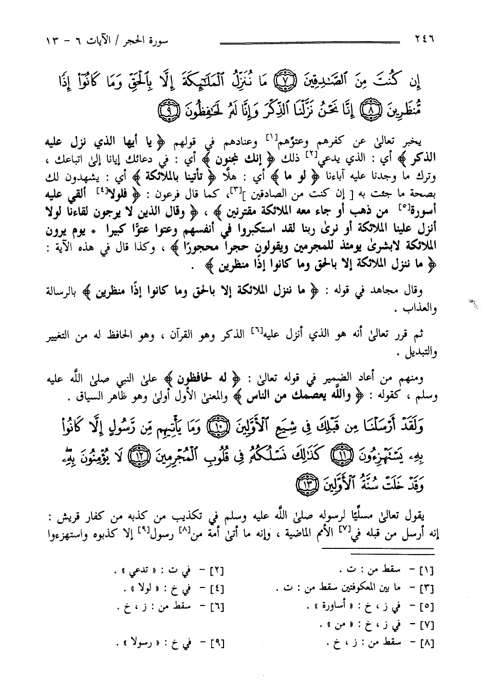 وَكَذَا قَالَ فِي هَذِهِ الْآيَة " مَا نُنَزِّل الْمَلَائِكَة إِلَّا بِالْحَقِّ وَمَا كَانُوا إذًا مُنْظَرِينَ " وَهُوَ الْقُرْآن وَهُوَ الْحَافِظ لَهُ مِنْ التَّغْيِير وَالتَّبْدِيل وَمِنْهُمْ مَنْ أَعَادَ الضَّمِير فِي قَوْله تَعَالَى " لَهُ لَحَافِظُونَ " عَلَى النَّبِيّ صَلَّى اللَّه عَلَيْهِ وَسَلَّمَ كَقَوْلِهِ " وَاَللَّه يَعْصِمك مِنْ النَّاس " وَالْمَعْنَى الْأَوَّل أَوْلَى وَهُوَ ظَاهِر السِّيَاق .