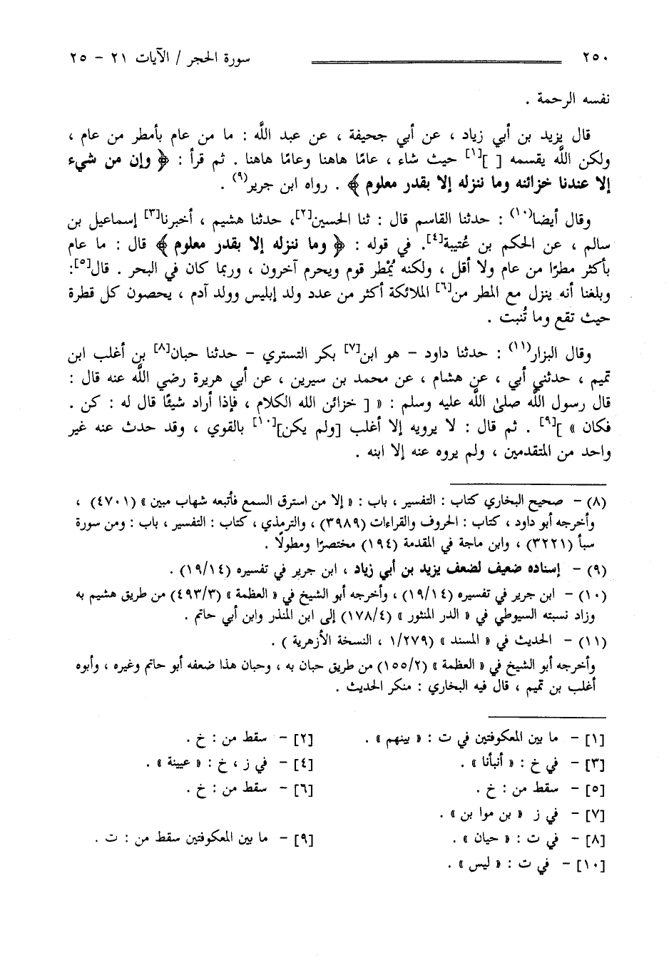 رَوَاهُ اِبْن جَرِير وَقَالَ أَيْضًا حَدَّثَنَا الْقَاسِم حَدَّثَنَا هُشَيْم أَخْبَرَنَا إِسْمَاعِيل بْن سَالِم عَنْ الْحَكَم بْن عُيَيْنَة فِي قَوْله " وَمَا نُنَزِّلهُ إِلَّا بِقَدَرٍ مَعْلُوم " قَالَ مَا عَام بِأَكْثَر مَطَرًا مِنْ عَام وَلَا أَقَلّ وَلَكِنَّهُ يُمْطَر قَوْم وَيُحْرَم آخَرُونَ بِمَا كَانَ فِي الْبَحْر قَالَ وَبَلَغَنَا أَنَّهُ يَنْزِل مَعَ الْمَطَر مِنْ الْمَلَائِكَة أَكْثَر مِنْ عَدَد وَلَد إِبْلِيس وَوَلَد آدَم يُحْصُونَ كُلّ قَطْرَة حَيْثُ تَقَع وَمَا تُنْبِت وَقَالَ الْبَزَّار حَدَّثَنَا دَاوُدُ هُوَ اِبْن بُكَيْر حَدَّثَنَا حَيَّان بْن أَغْلَب بْن تَمِيم حَدَّثَنِي أَبِي عَنْ هِشَام عَنْ مُحَمَّد بْن سِيرِينَ عَنْ أَبِي هُرَيْرَة رَضِيَ اللَّه عَنْهُ قَالَ : قَالَ رَسُول اللَّه صَلَّى اللَّه عَلَيْهِ وَسَلَّمَ " خَزَائِن اللَّه الْكَلَام فَإِذَا أَرَادَ شَيْئًا قَالَ لَهُ كُنْ فَكَانَ " ثُمَّ قَالَ لَا يَرْوِيه إِلَّا أَغْلَب وَلَيْسَ بِالْقَوِيِّ وَقَدْ حَدَّثَ عَنْهُ غَيْر وَاحِد مِنْ الْمُتَقَدِّمِينَ وَلَمْ يَرْوِهِ عَنْهُ إِلَّا اِبْنه .