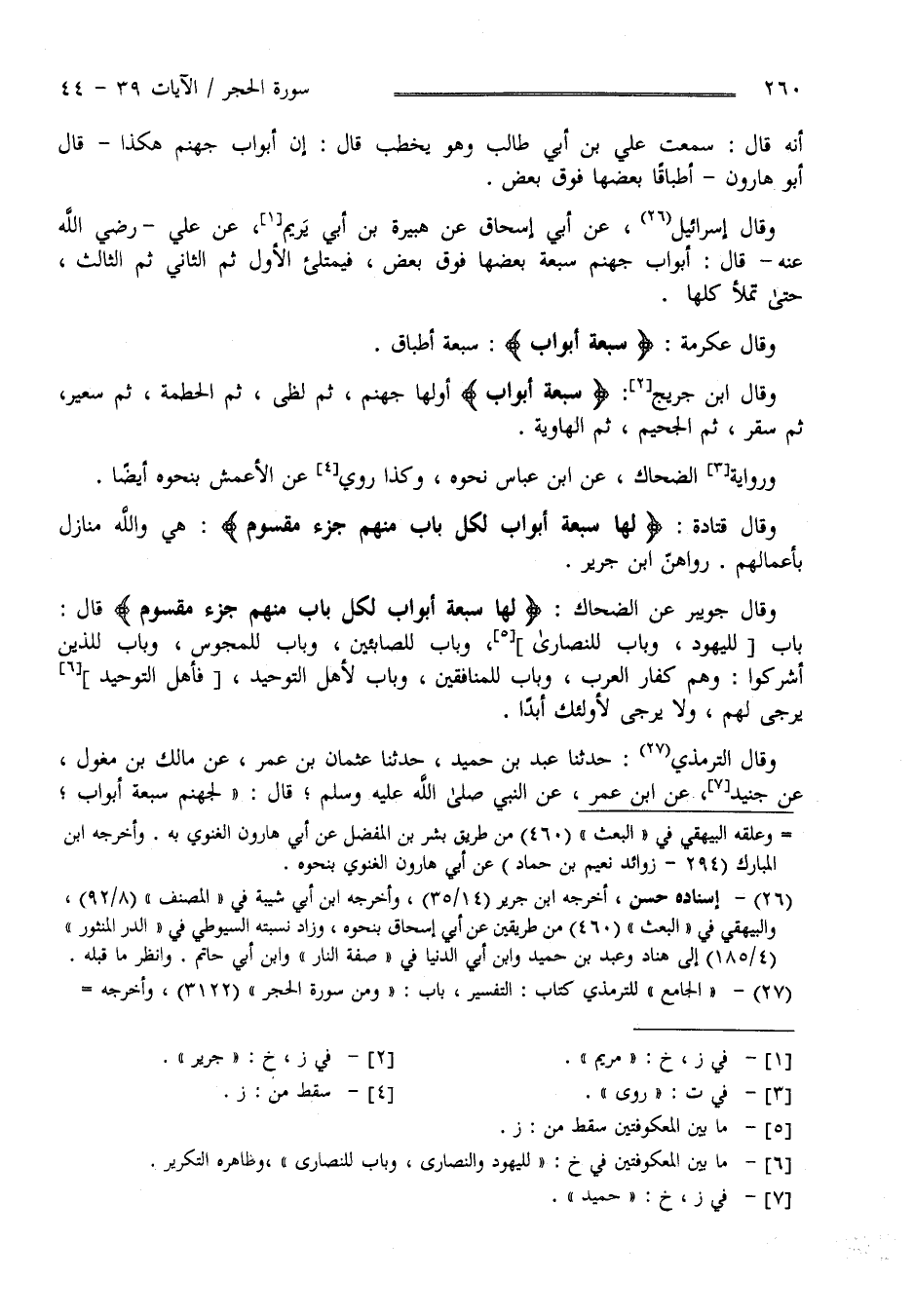 وَقَالَ التِّرْمِذِيّ حَدَّثَنَا عَبْد بْن حُمَيْد حَدَّثَنَا عُثْمَان بْن عُمَر عَنْ مَالِك بْن مِغْوَل عَنْ حُمَيْد عَنْ اِبْن عُمَر عَنْ النَّبِيّ صَلَّى اللَّه عَلَيْهِ وَسَلَّمَ قَالَ" لِجَهَنَّم سَبْعَة أَبْوَاب