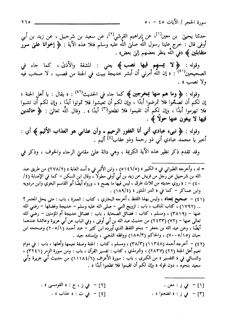 وَقَوْله " نَبِّئْ عِبَادِي أَنِّي أَنَا الْغَفُور الرَّحِيم وَأَنَّ عَذَابِي هُوَ الْعَذَاب الْأَلِيم " أَيْ أَخْبِرْ يَا مُحَمَّد عِبَادِي أَنِّي ذُو رَحْمَة وَذُو عَذَاب أَلِيم وَقَدْ تَقَدَّمَ ذِكْر نَظِير هَذِهِ الْآيَة الْكَرِيمَة وَهِيَ دَالَّة عَلَى مَقَامَيْ الرَّجَاء وَالْخَوْف وَذُكِرَ فِي
