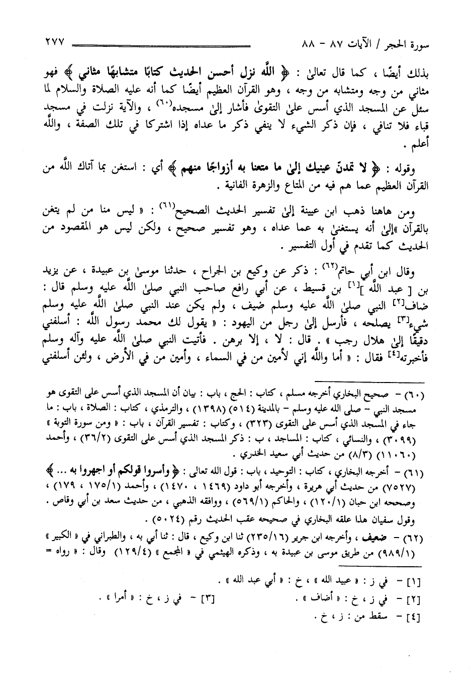 بِذَلِكَ أَيْضًا كَمَا قَالَ تَعَالَى " اللَّه نَزَّلَ أَحْسَن الْحَدِيث كِتَابًا مُتَشَابِهًا مَثَانِي " فَهُوَ مَثَانِي مِنْ وَجْه وَمُتَشَابِه مِنْ وَجْه وَهُوَ الْقُرْآن الْعَظِيم أَيْضًا كَمَا أَنَّهُ عَلَيْهِ الصَّلَاة وَالسَّلَام لَمَّا سُئِلَ عَنْ الْمَسْجِد الَّذِي أُسِّسَ عَلَى التَّقْوَى فَأَشَارَ إِلَى مَسْجِده وَالْآيَة نَزَلَتْ فِي مَسْجِد قُبَاء فَلَا تَنَافِي فَإِنَّ ذِكْر الشَّيْء لَا يَنْفِي ذِكْر مَا عَدَاهُ إِذَا اِشْتَرَكَا فِي تِلْكَ الصِّفَة وَاَللَّه أَعْلَم .