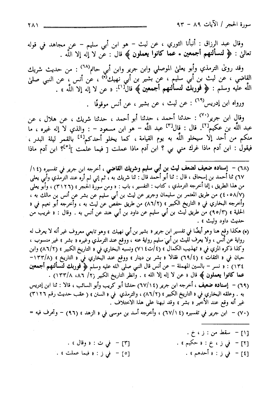 وَقَدْ رَوَى التِّرْمِذِيّ وَأَبُو يَعْلَى الْمَوْصِلِيّ وَابْن جَرِير وَابْن أَبِي حَاتِم مِنْ حَدِيث شَرِيك الْقَاضِي عَنْ لَيْث بْن أَبِي سُلَيْم عَنْ بَشِير بْن أَبِي نَهِيك عَنْ أَنَس عَنْ النَّبِيّ صَلَّى اللَّه عَلَيْهِ وَسَلَّمَ" فَوَرَبِّك لَنَسْأَلَنَّهُمْ أَجْمَعِينَ " قَالَ : عَنْ لَا إِلَه إِلَّا اللَّه وَرَوَاهُ اِبْن إِدْرِيس عَنْ لَيْث عَنْ بَشِير عَنْ أَنَس مَوْقُوفًا وَقَالَ اِبْن جَرِير : حَدَّثَنَا أَحْمَد حَدَّثَنَا أَبُو أَحْمَد حَدَّثَنَا شَرِيك عَنْ هِلَال عَنْ عَبْد اللَّه بْن حَكِيم قَالَ : وَرَوَاهُ التِّرْمِذِيّ وَغَيْره مِنْ حَدِيث أَنَس مَرْفُوعًا .