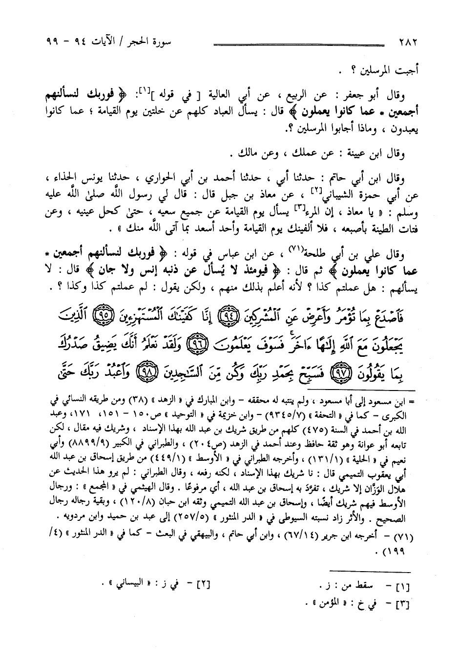 أَجَبْت الْمُرْسَلِينَ ؟ وَقَالَ أَبُو جَعْفَر عَنْ الرَّبِيع عَنْ أَبِي الْعَالِيَة فِي قَوْله " فَوَرَبِّك لَنَسْأَلَنَّهُمْ أَجْمَعِينَ عَمَّا كَانُوا يَعْمَلُونَ" قَالَ يُسْأَل الْعِبَاد كُلّهمْ عَنْ خُلَّتَيْنِ يَوْم الْقِيَامَة عَمَّا كَانُوا يَعْبُدُونَ وَعَنْ مَاذَا أَجَابُوا الْمُرْسَلِينَ وَقَالَ اِبْن عُيَيْنَة عَنْ عَمَلك وَعَنْ مَالِك وَقَالَ اِبْن أَبِي حَاتِم : حَدَّثَنَا أَبِي حَدَّثَنَا أَحْمَد بْن أَبِي الْحَوَارِيّ حَدَّثَنَا يُونُس الْحَذَّاء عَنْ أَبِي حَمْزَة الشَّيْبَانِيّ عَنْ مُعَاذ بْن جَبَل قَالَ : قَالَ رَسُول اللَّه صَلَّى اللَّه عَلَيْهِ وَسَلَّمَ " يَا مُعَاذ إِنَّ الْمَرْء يُسْأَل يَوْم الْقِيَامَة عَنْ جَمِيع سَعْيه حَتَّى كُحْل عَيْنَيْهِ وَعَنْ فُتَات الطِّينَة بِإِصْبَعِهِ فَلَا أُلْفِيَنَّك يَوْم الْقِيَامَة وَأَحَد غَيْرك أَسْعَد بِمَا آتَاك اللَّه مِنْك " وَقَالَ عَلِيّ بْن أَبِي طَلْحَة عَنْ اِبْن عَبَّاس فِي قَوْله " فَوَرَبِّك لَنَسْأَلَنَّهُمْ أَجْمَعِينَ عَمَّا كَانُوا يَعْمَلُونَ " ثُمَّ قَالَ " فَيَوْمئِذٍ لَا يُسْأَل عَنْ ذَنْبه إِنْس وَلَا جَانّ " قَالَ لَا يَسْأَلهُمْ هَلْ عَمِلْتُمْ كَذَا ؟ لِأَنَّهُ أَعْلَم ذَلِكَ مِنْهُمْ وَلَكِنْ يَقُول لِمَ عَمِلْتُمْ كَذَا وَكَذَا ؟ .
