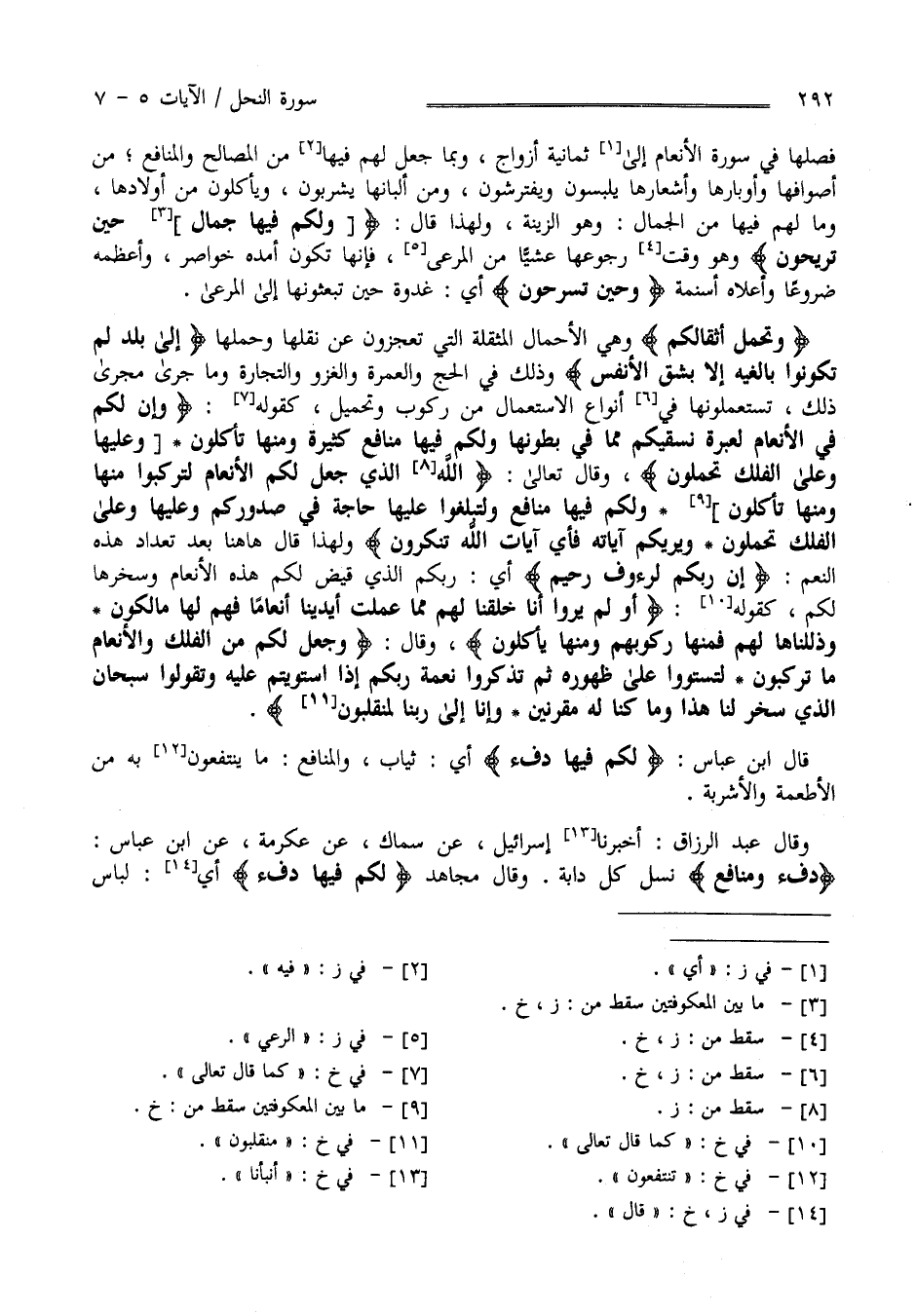 الْأَنْفُس إِنَّ رَبّكُمْ لَرَءُوف رَحِيم " " وَتَحْمِل أَثْقَالكُمْ " وَهِيَ الْأَحْمَال الثَّقِيلَة الَّتِي تَعْجِزُونَ عَنْ نَقْلهَا وَحَمْلهَا " إِلَى بَلَد لَمْ تَكُونُوا بَالِغِيهِ إِلَّا بِشِقِّ الْأَنْفُس " وَذَلِكَ فِي الْحَجّ وَالْعُمْرَة وَالْغَزْو وَالتِّجَارَة وَمَا جَرَى مَجْرَى ذَلِكَ تَسْتَعْمِلُونَهَا فِي أَنْوَاع الِاسْتِعْمَال مِنْ رُكُوب وَتَحْمِيل كَقَوْلِهِ " وَإِنَّ لَكُمْ فِي الْأَنْعَام لَعِبْرَة نَسْقِيكُمْ مِمَّا فِي بُطُونهَا وَلَكُمْ فِيهَا مَنَافِع كَثِيرَة وَمِنْهَا تَأْكُلُونَ وَعَلَيْهَا وَعَلَى الْفُلْك تُحْمَلُونَ " وَقَالَ تَعَالَى " اللَّه الَّذِي جَعَلَ لَكُمْ الْأَنْعَام لِتَرْكَبُوا مِنْهَا وَمِنْهَا تَأْكُلُونَ وَلَكُمْ فِيهَا مَنَافِع وَلِتَبْلُغُوا عَلَيْهَا حَاجَة فِي صُدُوركُمْ وَعَلَيْهَا وَعَلَى الْفُلْك تُحْمَلُونَ وَيُرِيكُمْ آيَاته فَأَيّ آيَات اللَّه تُنْكِرُونَ " وَلِهَذَا قَالَ هُنَا بَعْد تَعْدَاد هَذِهِ النِّعَم " إِنَّ رَبّكُمْ لَرَءُوف رَحِيم " أَيْ رَبّكُمْ الَّذِي قَيَّضَ لَكُمْ هَذِهِ الْأَنْعَام وَسَخَّرَهَا لَكُمْ كَقَوْلِهِ " أَوَلَمْ يَرَوْا أَنَّا خَلَقْنَا لَهُمْ مِمَّا عَمِلَتْ أَيْدِينَا أَنْعَامًا فَهُمْ لَهَا مَالِكُونَ وَذَلَّلْنَاهَا لَهُمْ فَمِنْهَا رَكُوبهمْ وَمِنْهَا يَأْكُلُونَ " وَقَالَ " وَجَعَلَ لَكُمْ مِنْ الْفُلْك وَالْأَنْعَام مَا تَرْكَبُونَ لِتَسْتَوُوا عَلَى ظُهُوره ثُمَّ تَذْكُرُوا نِعْمَة رَبّكُمْ إِذَا اِسْتَوَيْتُمْ عَلَيْهِ وَتَقُولُوا سُبْحَان الَّذِي سَخَّرَ لَنَا هَذَا وَمَا كُنَّا لَهُ مُقْرِنِينَ وَإِنَّا إِلَى رَبّنَا لَمُنْقَلِبُونَ " قَالَ اِبْن عَبَّاس : " لَكُمْ فِيهَا دِفْء " أَيْ ثِيَاب وَ " وَمَنَافِع " مَا يَنْتَفِعُونَ بِهِ مِنْ الْأَطْعِمَة وَالْأَشْرِبَة وَقَالَ عَبْد الرَّزَّاق : أَخْبَرَنَا إِسْرَائِيل عَنْ سِمَاك عَنْ عِكْرِمَة عَنْ اِبْن عَبَّاس : دِفْء وَمَنَافِع نَسْل كُلّ دَابَّة وَقَالَ مُجَاهِد لَكُمْ فِيهَا دِفْء أَيْ لِبَاس