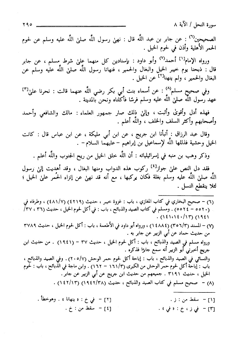 وَفِي صَحِيح مُسْلِم عَنْ أَسْمَاء بِنْت أَبِي بَكْر رَضِيَ اللَّه عَنْهُمَا قَالَتْ : نَحَرْنَا عَلَى عَهْد رَسُول اللَّه صَلَّى اللَّه عَلَيْهِ وَسَلَّمَ فَرَسًا فَأَكَلْنَاهُ وَنَحْنُ بِالْمَدِينَةِ فَهَذِهِ أَدَلّ وَأَقْوَى وَأَثْبَت وَإِلَى ذَلِكَ صَارَ جُمْهُور الْعُلَمَاء مَالِك وَالشَّافِعِيّ وَأَحْمَد وَأَصْحَابهمْ وَأَكْثَر السَّلَف وَالْخَلَف وَاَللَّه أَعْلَم .