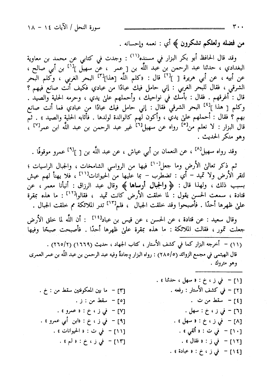 وَقَدْ قَالَ الْحَافِظ أَبُو بَكْر الْبَزَّار فِي مُسْنَده : وَجَدْت فِي كِتَابِي عَنْ مُحَمَّد بْن مُعَاوِيَة الْبَغْدَادِيّ حَدَّثَنَا عَبْد الرَّحْمَن بْن عَبْد اللَّه بْن عَمْرو عَنْ سَهْل بْن أَبَى صَالِح عَنْ أَبِيهِ عَنْ أَبِي هُرَيْرَة قَالَ : كَلَّمَ اللَّه الْبَحْر الْغَرْبِيّ وَكَلَّمَ الْبَحْر الشَّرْقِيّ فَقَالَ لِلْبَحْرِ الْغَرْبِيّ إِنِّي حَامِل فِيك عِبَادًا مِنْ عِبَادِي فَكَيْف أَنْتَ صَانِع فِيهِمْ ؟ قَالَ أُغْرِقهُمْ فَقَالَ بَأْسك فِي نَوَاحِيك وَاحْمِلْهُمْ عَلَى يَدَيَّ وَحَرَّمْت الْحِلْيَة وَالصَّيْد وَكَلَّمَ الْبَحْر الشَّرْقِيّ فَقَالَ : إِنِّي حَامِل فِيك عِبَادًا مِنْ عِبَادِي فَمَا أَنْتَ صَانِع بِهِمْ ؟ فَقَالَ : أَحْمِلهُمْ عَلَى يَدَيَّ وَأَكُون لَهُمْ كَالْوَالِدَةِ لِوَلَدِهَا فَأَثَابَهُ الْحِلْيَة وَالصَّيْد ثُمَّ قَالَ الْبَزَّار لَا نَعْلَم مَنْ رَوَاهُ عَنْ سَهْل غَيْر عَبْد الرَّحْمَن بْن عَبْد اللَّه بْن عَمْرو وَهُوَ مُنْكَر الْحَدِيث وَقَدْ رَوَاهُ سَهْل عَنْ النُّعْمَان بْن أَبِي عَيَّاش عَنْ عَبْد اللَّه بْن عَمْرو مَوْقُوفًا .