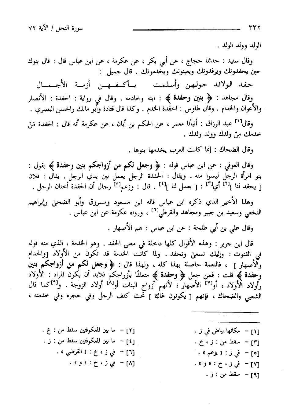 قَالَ اِبْن جَرِير : وَهَذِهِ الْأَقْوَال كُلّهَا دَاخِلَة فِي مَعْنَى الْحَفَدَة وَهُوَ الْخِدْمَة الَّذِي مِنْهُ قَوْله فِي الْقُنُوت : وَإِلَيْك نَسْعَى وَنَحْفِد وَلَمَّا كَانَتْ الْخِدْمَة قَدْ تَكُون مِنْ الْأَوْلَاد وَالْخَدَم وَالْأَصْهَار فَالنِّعْمَة حَاصِلَة بِهَذَا كُلّه وَلِهَذَا قَالَ " وَجَعَلَ لَكُمْ مِنْ أَزْوَاجكُمْ بَنِينَ وَحَفَدَة " قُلْت فَمَنْ جَعَلَ " وَحَفَدَة " مُتَعَلِّقًا بِأَزْوَاجِكُمْ فَلَا بُدّ أَنْ يَكُون الْمُرَاد الْأَوْلَاد وَأَوْلَاد الْأَوْلَاد أَوْ الْأَصْهَار لِأَنَّهُمْ أَزْوَاج الْبَنَات أَوْ أَوْلَاد الزَّوْجَة وَكَذَا قَالَ الشَّعْبِيّ وَالضَّحَّاك فَإِنَّهُمْ يَكُونُونَ غَالِبًا تَحْت كَنَف الرَّجُل وَفِي حِجْره وَفِي خِدْمَته