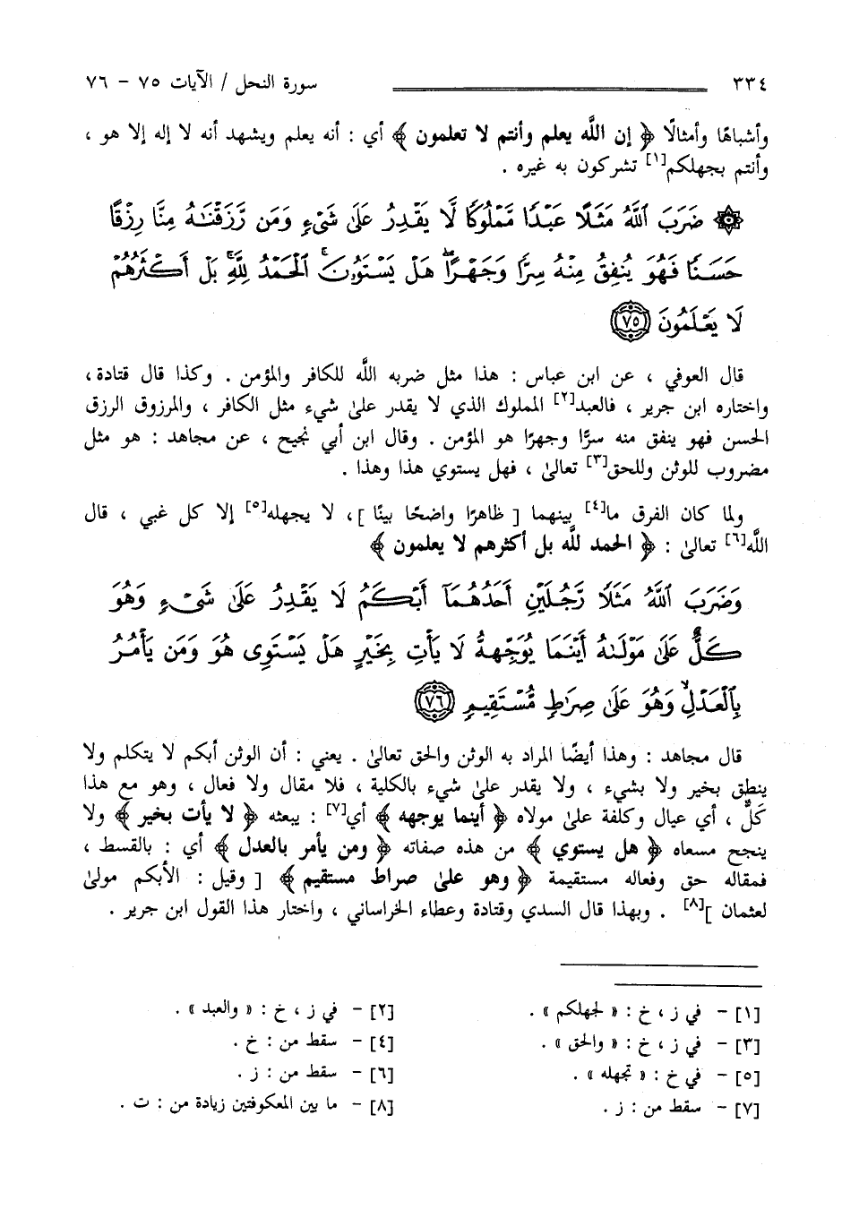 ضَرَبَ اللَّهُ مَثَلًا عَبْدًا مَمْلُوكًا لَا يَقْدِرُ عَلَى شَيْءٍ وَمَنْ رَزَقْنَاهُ مِنَّا رِزْقًا حَسَنًا فَهُوَ يُنْفِقُ مِنْهُ سِرًّا وَجَهْرًا هَلْ يَسْتَوُونَ الْحَمْدُ لِلَّهِ بَلْ أَكْثَرُهُمْ لَا يَعْلَمُونَ (75)