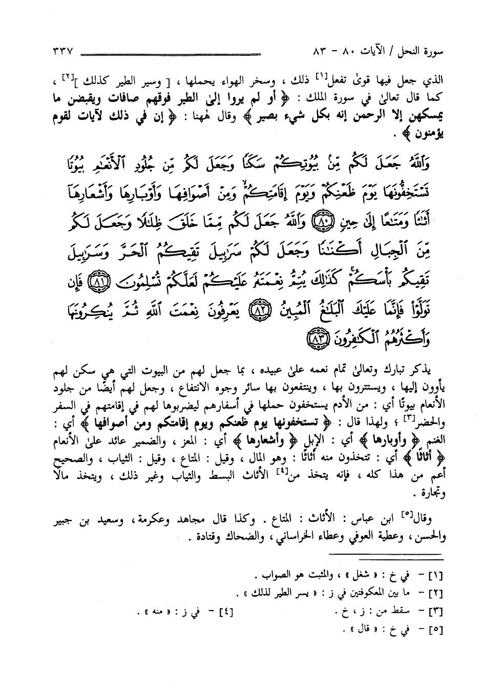 يَذْكُر تَبَارَكَ وَتَعَالَى تَمَام نِعَمه عَلَى عَبِيده بِمَا جَعَلَ لَهُمْ مِنْ الْبُيُوت الَّتِي هِيَ سَكَن لِمَ يَأْوُونَ إِلَيْهَا وَيَسْتَتِرُونَ بِهَا وَيَنْتَفِعُونَ بِهَا بِسَائِرِ وُجُوه الِانْتِفَاع وَجَعَلَ لَهُمْ أَيْضًا مِنْ جُلُود الْأَنْعَام بُيُوتًا أَيْ مِنْ الْأُدُم يَسْتَخِفُّونَ حَمْلهَا فِي أَسْفَارهمْ لِيَضْرِبُوهَا لَهُمْ فِي إِقَامَتهمْ فِي السَّفَر وَالْحَضَر وَلِهَذَا قَالَ " تَسْتَخِفُّونَهَا يَوْم ظَعْنكُمْ وَيَوْم إِقَامَتكُمْ وَمِنْ أَصْوَافهَا " أَيْ الْغَنَم " وَأَوْبَارهَا " أَيْ الْإِبِل " وَأَشْعَارهَا " أَيْ الْمَعْز وَالضَّمِير عَائِد عَلَى الْأَنْعَام" أَثَاثًا " أَيْ تَتَّخِذُونَ مِنْهُ أَثَاثًا وَهُوَ الْمَال وَقِيلَ الْمَتَاع وَقِيلَ الثِّيَاب وَالصَّحِيح أَعَمّ مِنْ هَذَا كُلّه فَإِنَّهُ يَتَّخِذ مِنْ الْأَثَاث الْبُسُط وَالثِّيَاب وَغَيْر ذَلِكَ وَيَتَّخِذ مَالًا وَتِجَارَة وَقَالَ اِبْن عَبَّاس الْأَثَاث الْمَتَاع وَكَذَا قَالَ مُجَاهِد وَعِكْرِمَة وَسَعِيد بْن جُبَيْر وَالْحَسَن وَعَطِيَّة الْعَوْفِيّ وَعَطَاء الْخُرَاسَانِيّ وَالضَّحَّاك وَقَتَادَة