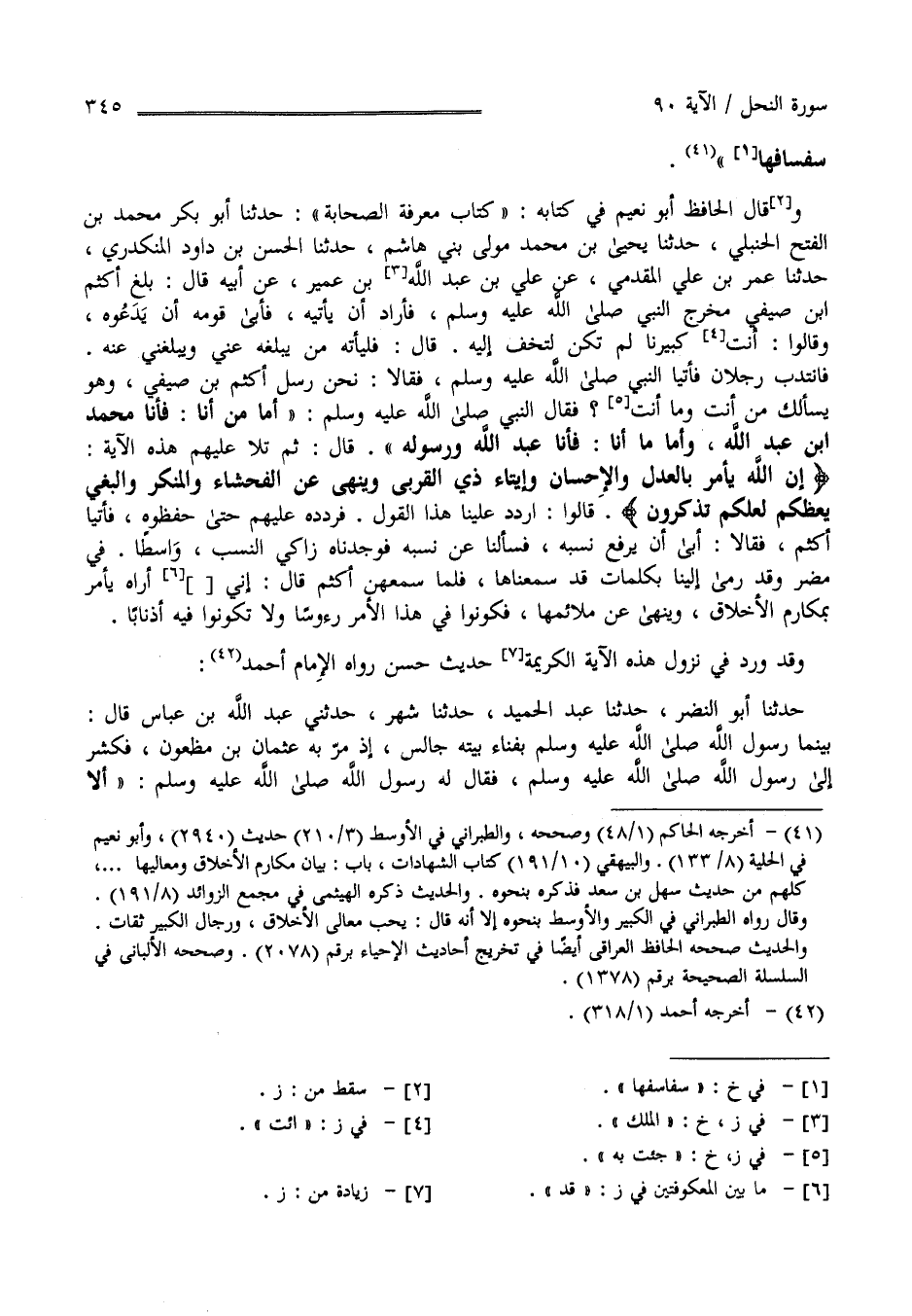 قَالُوا رَدِّدْ عَلَيْنَا هَذَا الْقَوْل فَرَدَّدَهُ عَلَيْهِمْ حَتَّى حَفِظُوهُ فَأَتَيَا أَكْثَم فَقَالَا أَبَى أَنْ يَرْفَع نَسَبه فَسَأَلْنَا عَنْ نَسَبه فَوَجَدْنَاهُ زَاكِي النَّسَب وَسَطًا فِي مُضَر - أَيْ شَرِيفًا - وَقَدْ رَمَى إِلَيْنَا بِكَلِمَاتٍ قَدْ سَمِعْنَاهَا فَلَمَّا سَمِعَهُنَّ أَكْثَم قَالَ : إِنِّي أَرَاهُ يَأْمُر بِمَكَارِمِ الْأَخْلَاق وَيَنْهَى عَنْ مَلَائِمِهَا فَكُونُوا فِي هَذَا الْأَمْر رُءُوسًا وَلَا تَكُونُوا فِيهِ أَذْنَابًا وَقَدْ وَرَدَ فِي نُزُولهَا حَدِيث حَسَن رَوَاهُ الْإِمَام أَحْمَد : حَدَّثَنَا أَبُو النَّضْر حَدَّثَنَا عَبْد الْحَمِيد حَدَّثَنَا شَهْر حَدَّثَنِي عَبْد اللَّه بْن عَبَّاس قَالَ بَيْنَمَا رَسُول اللَّه صَلَّى اللَّه عَلَيْهِ وَسَلَّمَ بِفِنَاءِ بَيْته جَالِس إِذْ مَرَّ بِهِ عُثْمَان بْن مَظْعُون فَكَشَرَ إِلَى رَسُول اللَّه صَلَّى اللَّه عَلَيْهِ وَسَلَّمَ فَقَالَ لَهُ رَسُول اللَّه صَلَّى اللَّه عَلَيْهِ وَسَلَّمَ " أَلَا