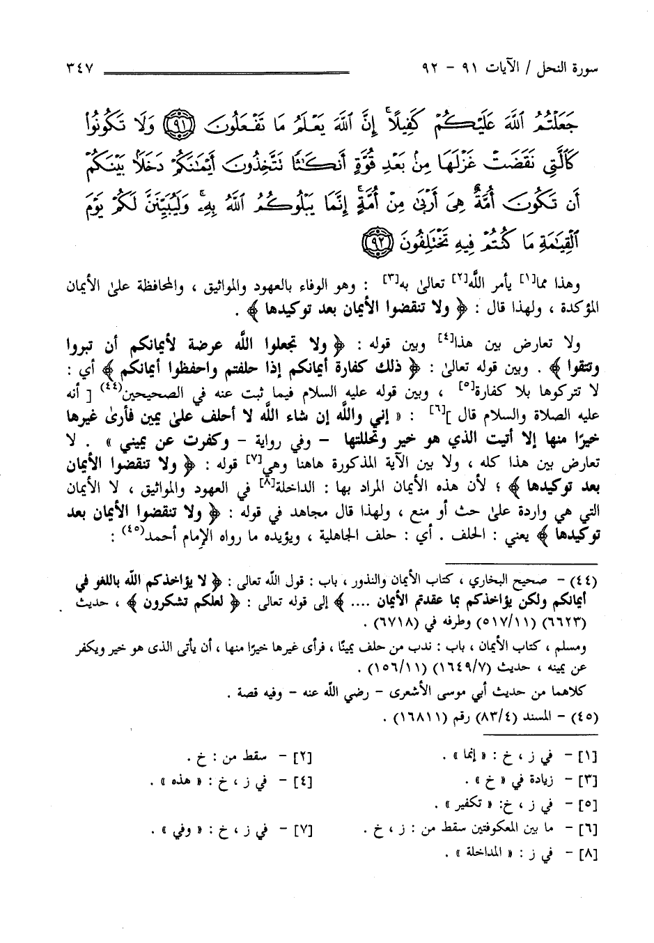 وَبَيْن قَوْله تَعَالَى" ذَلِكَ كَفَّارَة أَيْمَانكُمْ إِذَا حَلَفْتُمْ وَاحْفَظُوا أَيْمَانكُمْ " أَيْ لَا تَتْرُكُوهَا بِلَا كَفَّارَة وَبَيْن قَوْله عَلَيْهِ السَّلَام فِيمَا ثَبَتَ عَنْهُ فِي الصَّحِيحَيْنِ أَنَّهُ عَلَيْهِ الصَّلَاة وَالسَّلَام قَالَ " إِنِّي وَاَللَّه إِنْ شَاءَ اللَّه لَا أَحْلِف عَلَى يَمِين فَأَرَى غَيْرهَا خَيْرًا مِنْهَا إِلَّا أَتَيْت الَّذِي هُوَ خَيْر وَتَحَلَّلْتهَا - وَفِي رِوَايَة - وَكَفَّرْت عَنْ يَمِينِي " لَا تَعَارُض بَيْن هَذَا كُلّه وَلَا بَيْن الْآيَة الْمَذْكُورَة هَاهُنَا وَهِيَ قَوْله " وَلَا تَنْقُضُوا الْأَيْمَان بَعْد تَوْكِيدهَا " لِأَنَّ هَذِهِ الْأَيْمَان الْمُرَاد بِهَا الدَّاخِلَة فِي الْعُهُود وَالْمَوَاثِيق لَا الْأَيْمَان الَّتِي هِيَ وَارِدَة عَلَى حَثّ أَوْ مَنْع وَلِهَذَا قَالَ مُجَاهِد فِي قَوْله " وَلَا تَنْقُضُوا الْأَيْمَان بَعْد تَوْكِيدهَا " يَعْنِي الْحَلِف أَيْ حَلِف الْجَاهِلِيَّة وَيُؤَيِّدهُ مَا رَوَاهُ الْإِمَام أَحْمَد
