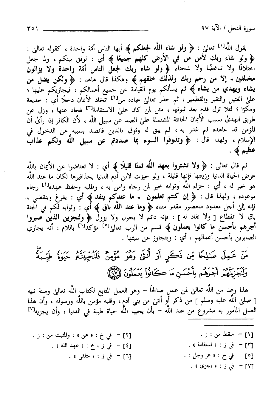 هَذَا وَعْد مِنْ اللَّه تَعَالَى لِمَنْ عَمِلَ صَالِحًا وَهُوَ الْعَمَل الْمُتَابِع لِكِتَابِ اللَّه تَعَالَى وَسُنَّة نَبِيّه صَلَّى اللَّه عَلَيْهِ وَسَلَّمَ مِنْ ذَكَر أَوْ أُنْثَى مِنْ بَنِي آدَم وَقَلْبه مُؤْمِن بِاَللَّهِ وَرَسُوله وَإِنَّ هَذَا الْعَمَل الْمَأْمُور بِهِ مَشْرُوع مِنْ عِنْد اللَّه بِأَنْ يُحْيِيه اللَّه حَيَاة طَيِّبَة فِي الدُّنْيَا وَأَنْ يَجْزِيه