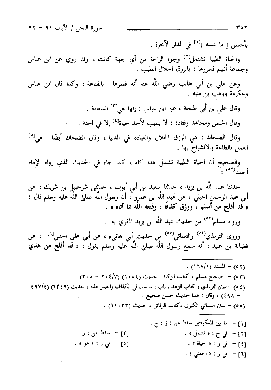 بِأَحْسَن مَا عَمِلَهُ فِي الدَّار الْآخِرَة وَالْحَيَاة الطَّيِّبَة تَشْتَمِل وُجُوه الرَّاحَة مِنْ أَيّ جِهَة كَانَتْ وَقَدْ رُوِيَ عَنْ اِبْن عَبَّاس وَجَمَاعَة أَنَّهُمْ فَسَّرُوهَا بِالرِّزْقِ الْحَلَال الطَّيِّب وَعَنْ عَلِيّ بْن أَبِي طَالِب رَضِيَ اللَّه عَنْهُ أَنَّهُ فَسَّرَهَا بِالْقَنَاعَةِ وَكَذَا قَالَ اِبْن عَبَّاس وَعِكْرِمَة وَوَهْب بْن مُنَبِّه وَقَالَ عَلِيّ بْن أَبِي طَلْحَة عَنْ اِبْن عَبَّاس أَنَّهَا هِيَ السَّعَادَة وَقَالَ الْحَسَن وَمُجَاهِد وَقَتَادَة لَا يَطِيب لِأَحَدٍ حَيَاة إِلَّا فِي الْجَنَّة وَقَالَ الضَّحَّاك هِيَ الرِّزْق الْحَلَال وَالْعِبَادَة فِي الدُّنْيَا وَقَالَ الضَّحَّاك أَيْضًا هِيَ الْعَمَل بِالطَّاعَةِ وَالِانْشِرَاح بِهَا وَالصَّحِيح أَنَّ الْحَيَاة الطَّيِّبَة تَشْمَل هَذَا كُلّه كَمَا جَاءَ فِي الْحَدِيث الَّذِي رَوَاهُ الْإِمَام أَحْمَد حَدَّثَنَا عَبْد اللَّه بْن يَزِيد حَدَّثَنَا سَعِيد بْن أَبِي أَيُّوب حَدَّثَنِي شُرَحْبِيل بْن أَبِي شَرِيك عَنْ عَبْد الرَّحْمَن الْحُبُلِيّ عَنْ عَبْد اللَّه بْن عُمَر أَنَّ رَسُول اللَّه صَلَّى اللَّه عَلَيْهِ وَسَلَّمَ قَالَ " قَدْ أَفْلَحَ مَنْ أَسْلَمَ وَرُزِقَ كَفَافًا وَقَنَّعَهُ اللَّه بِمَا آتَاهُ " وَرَوَاهُ مُسْلِم مِنْ حَدِيث عَبْد اللَّه بْن يَزِيد الْمُقْرِي بِهِ وَرَوَى التِّرْمِذِيّ وَالنَّسَائِيّ مِنْ حَدِيث أَبِي هَانِئ عَنْ اِبْن عَلِيّ الْجُهَنِيّ عَنْ فَضَالَة بْن عُبَيْد أَنَّهُ سَمِعَ رَسُول اللَّه صَلَّى اللَّه عَلَيْهِ وَسَلَّمَ يَقُول " قَدْ أَفْلَحَ مَنْ هُدِيَ