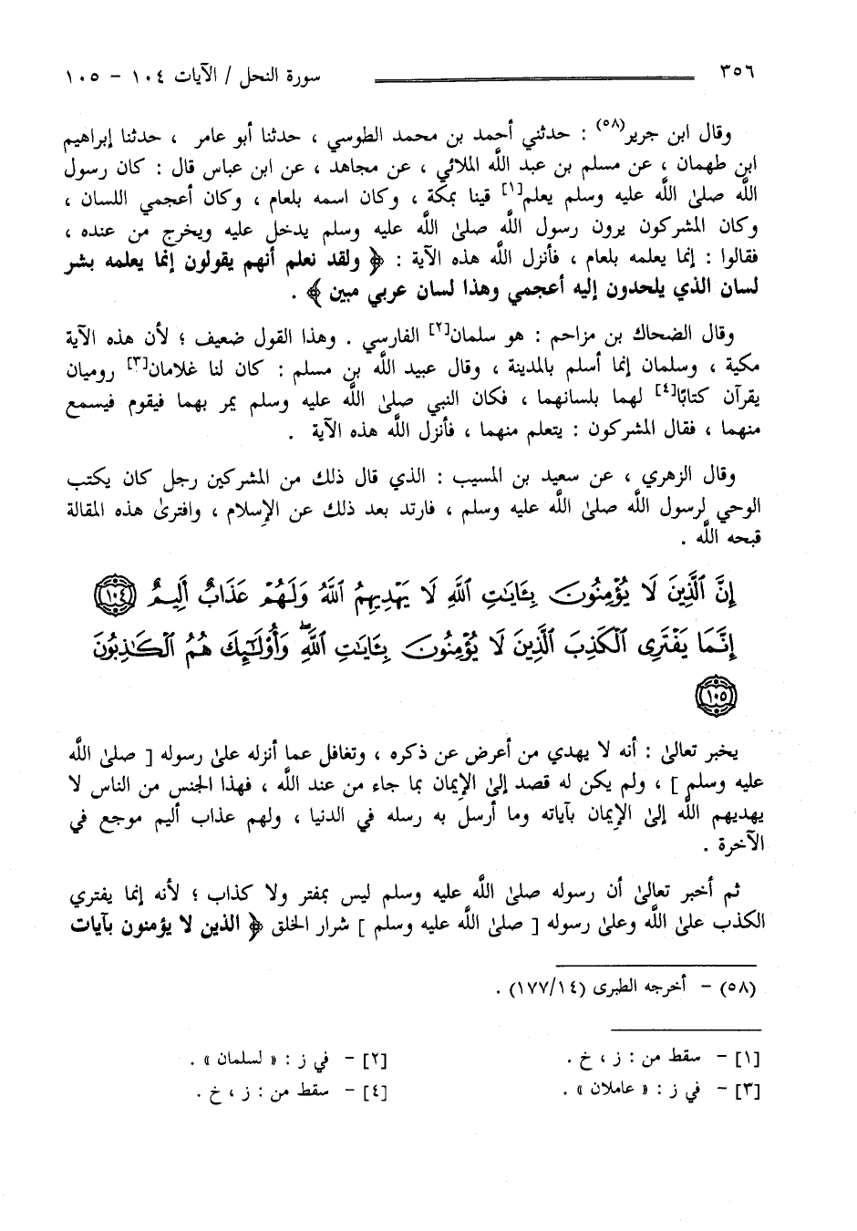 وَقَالَ اِبْن جَرِير حَدَّثَنِي أَحْمَد بْن مُحَمَّد الطُّوسِيّ حَدَّثَنَا أَبُو عَامِر حَدَّثَنَا إِبْرَاهِيم بْن طَهْمَان عَنْ مُسْلِم بْن عَبْد اللَّه الْمُلَائِيّ عَنْ مُجَاهِد عَنْ اِبْن عَبَّاس قَالَ : كَانَ رَسُول اللَّه صَلَّى اللَّه عَلَيْهِ وَسَلَّمَ يَعْلَم قَيْنًا بِمَكَّة وَكَانَ اِسْمه بَلْعَام وَكَانَ أَعْجَمِيّ اللِّسَان وَكَانَ الْمُشْرِكُونَ يَرَوْنَ رَسُول اللَّه صَلَّى اللَّه عَلَيْهِ وَسَلَّمَ يَدْخُل عَلَيْهِ وَيَخْرُج مِنْ عِنْده فَقَالُوا إِنَّمَا يُعَلِّمهُ بَلْعَام فَأَنْزَلَ اللَّه هَذِهِ الْآيَة " وَلَقَدْ نَعْلَم أَنَّهُمْ يَقُولُونَ إِنَّمَا يُعَلِّمهُ بَشَر لِسَان الَّذِي يُلْحِدُونَ إِلَيْهِ أَعْجَمِيّ وَهَذَا لِسَان عَرَبِيّ مُبِين " وَقَالَ الضَّحَّاك بْن مُزَاحِم هُوَ سَلْمَان الْفَارِسِيّ وَهَذَا الْقَوْل ضَعِيف لِأَنَّ هَذِهِ الْآيَة مَكِّيَّة وَسَلْمَان إِنَّمَا أَسْلَمَ بِالْمَدِينَةِ وَقَالَ عُبَيْد اللَّه بْن مُسْلِم كَانَ لَنَا غُلَامَانِ رُومِيَّانِ يَقْرَآنِ كِتَابًا لَهُمَا بِلِسَانِهِمَا فَكَانَ النَّبِيّ صَلَّى اللَّه عَلَيْهِ وَسَلَّمَ يَمُرّ بِهِمَا فَيَقُوم فَيَسْمَع مِنْهُمَا فَقَالَ الْمُشْرِكُونَ يَتَعَلَّم مِنْهُمَا فَأَنْزَلَ اللَّه هَذِهِ الْآيَة وَقَالَ الزُّهْرِيّ عَنْ سَعِيد بْن الْمُسَيِّب : الَّذِي قَالَ ذَلِكَ مِنْ الْمُشْرِكِينَ رَجُل كَانَ يَكْتُب الْوَحْي لِرَسُولِ اللَّه صَلَّى اللَّه عَلَيْهِ وَسَلَّمَ فَارْتَدَّ بَعْد ذَلِكَ عَنْ الْإِسْلَام وَافْتَرَى هَذِهِ الْمَقَالَة قَبَّحَهُ اللَّه .