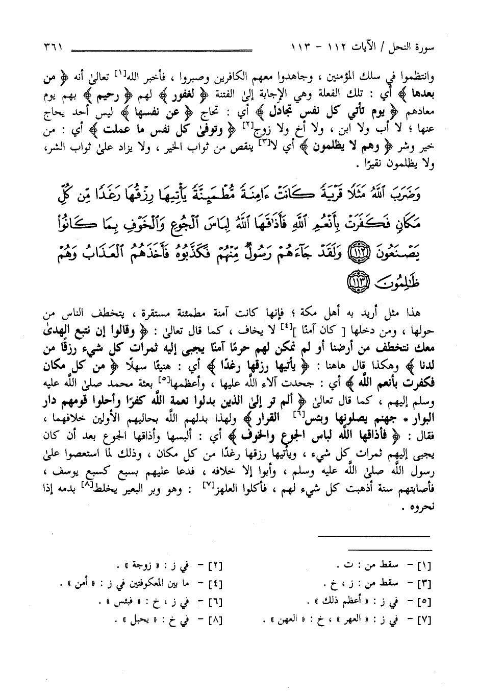 وَضَرَبَ اللَّهُ مَثَلًا قَرْيَةً كَانَتْ آَمِنَةً مُطْمَئِنَّةً يَأْتِيهَا رِزْقُهَا رَغَدًا مِنْ كُلِّ مَكَانٍ فَكَفَرَتْ بِأَنْعُمِ اللَّهِ فَأَذَاقَهَا اللَّهُ لِبَاسَ الْجُوعِ وَالْخَوْفِ بِمَا كَانُوا يَصْنَعُونَ (112)