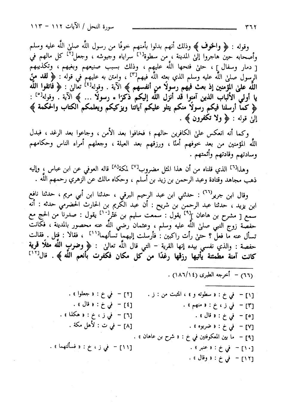 وَهَذَا الَّذِي قُلْنَاهُ مِنْ أَنَّ هَذَا الْمَثَل ضُرِبَ لِأَهْلِ مَكَّة قَالَهُ الْعَوْفِيّ عَنْ اِبْن عَبَّاس وَإِلَيْهِ ذَهَبَ مُجَاهِد وَقَتَادَة وَعَبْد الرَّحْمَن بْن زَيْد بْن أَسْلَمَ وَحَكَاهُ مَالِك عَنْ الزُّهْرِيّ رَحِمَهُمْ اللَّه وَقَالَ اِبْن جَرِير حَدَّثَنِي اِبْن عَبْد الرَّحِيم الْبَرْقِيّ حَدَّثَنَا اِبْن أَبِي مَرْيَم حَدَّثَنَا نَافِع بْن يَزِيد حَدَّثَنَا عَبْد الرَّحْمَن بْن شُرَيْح أَنَّ عَبْد الْكَرِيم بْن الْحَارِث الْحَضْرَمِيّ حَدَّثَهُ أَنَّهُ سَمِعَ مِشْرَح بْن هَاعَان يَقُول سَمِعْت سُلَيْم بْن نُمَيْر يَقُول صَدَرْنَا مِنْ الْحَجّ مَعَ حَفْصَة زَوْج النَّبِيّ صَلَّى اللَّه عَلَيْهِ وَسَلَّمَ وَعُثْمَان رَضِيَ اللَّه عَنْهُ مَحْصُور بِالْمَدِينَةِ فَكَانَتْ تَسْأَل عَنْهُ مَا فَعَلَ ؟ حَتَّى رَأَتْ رَاكِبَيْنِ فَأَرْسَلَتْ إِلَيْهِمَا تَسْأَلهُمَا فَقَالَا قُتِلَ.