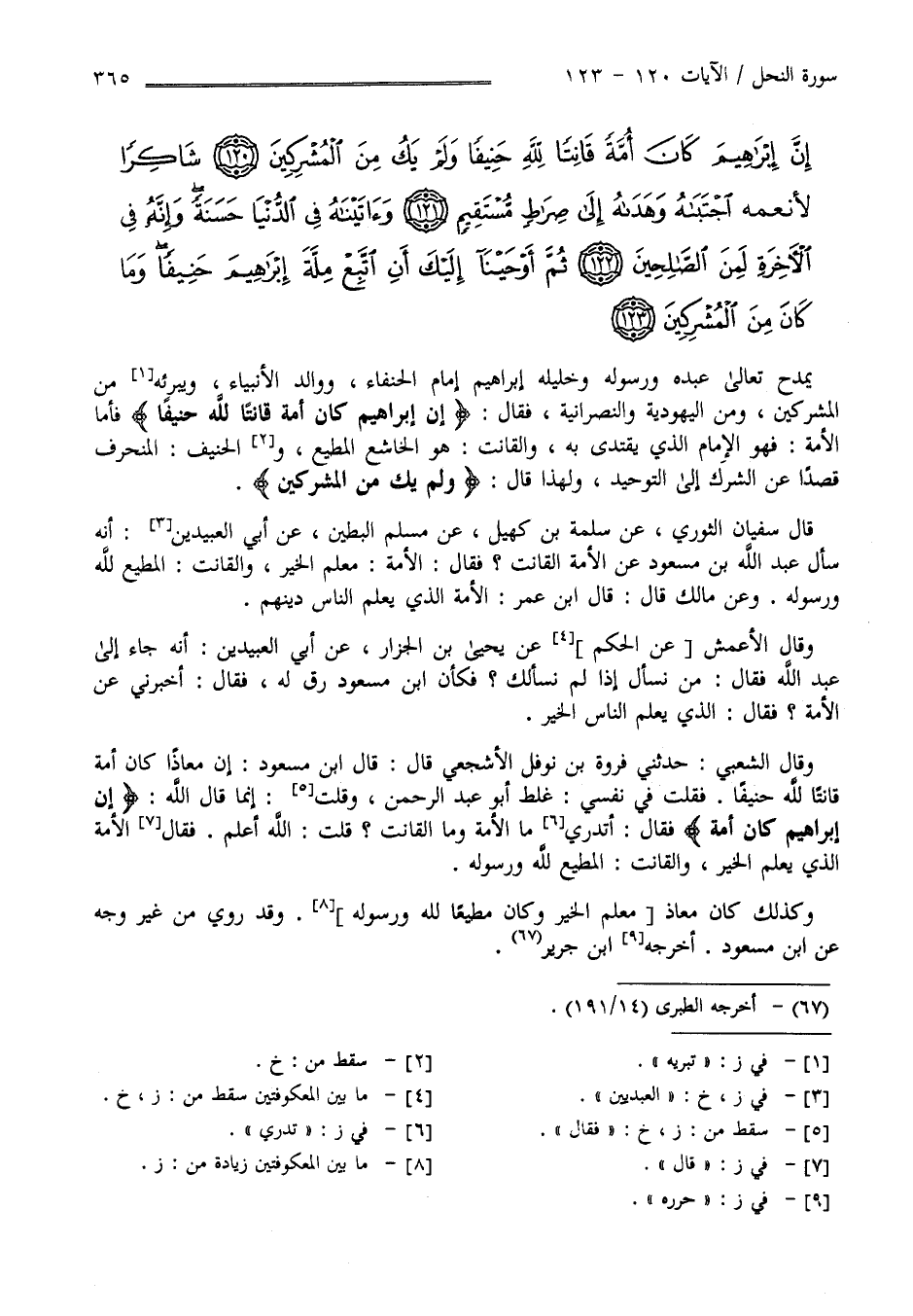 يَمْدَح تَعَالَى عَبْده وَرَسُوله وَخَلِيله إِبْرَاهِيم إِمَام الْحُنَفَاء وَوَالِد الْأَنْبِيَاء وَيُبَرِّئهُ مِنْ الْمُشْرِكِينَ وَمِنْ الْيَهُودِيَّة وَالنَّصْرَانِيَّة فَقَالَ " إِنَّ إِبْرَاهِيم كَانَ أُمَّة قَانِتًا لِلَّهِ حَنِيفًا " فَأَمَّا الْأُمَّة فَهُوَ الْإِمَام الَّذِي يُقْتَدَى بِهِ وَالْقَانِت هُوَ الْخَاشِع الْمُطِيع وَالْحَنِيف الْمُنْحَرِف قَصْدًا عَنْ الشِّرْك إِلَى التَّوْحِيد وَلِهَذَا قَالَ " وَلَمْ يَكُ مِنْ الْمُشْرِكِينَ " قَالَ سُفْيَان الثَّوْرِيّ عَنْ سَلَمَة بْن كُهَيْل عَنْ مُسْلِم الْبَطِين عَنْ أَبِي الْعُبَيْدَيْنِ أَنَّهُ سَأَلَ عَبْد اللَّه بْن مَسْعُود عَنْ الْأُمَّة الْقَانِت فَقَالَ الْأُمَّة مُعَلِّم الْخَيْر وَالْقَانِت الْمُطِيع لِلَّهِ وَرَسُوله وَعَنْ مَالِك قَالَ : قَالَ اِبْن عُمَر : الْأُمَّة الَّذِي يُعَلِّم النَّاس دِينهمْ وَقَالَ الْأَعْمَش عَنْ يَحْيَى بْن الْجَزَّار عَنْ أَبِي الْعُبَيْدَيْنِ أَنَّهُ جَاءَ إِلَى عَبْد اللَّه فَقَالَ مَنْ نَسْأَل إِذَا لَمْ نَسْأَلك ؟ فَكَأَنَّ اِبْن مَسْعُود رَقَّ لَهُ فَقَالَ أَخْبِرْنِي عَنْ الْأُمَّة فَقَالَ الَّذِي يُعَلِّم النَّاس الْخَيْر وَقَالَ الشَّعْبِيّ حَدَّثَنِي فَرْوَة بْن نَوْفَل الْأَشْجَعِيّ قَالَ : قَالَ اِبْن مَسْعُود إِنَّ مُعَاذًا كَانَ أُمَّة قَانِتًا لِلَّهِ حَنِيفًا فَقُلْت فِي نَفْسِي غَلِطَ أَبُو عَبْد الرَّحْمَن وَقَالَ إِنَّمَا قَالَ اللَّه " إِنَّ إِبْرَاهِيم كَانَ أُمَّة " فَقَالَ تَدْرِي مَا الْأُمَّة وَمَا الْقَانِت ؟ قُلْت اللَّه أَعْلَم .