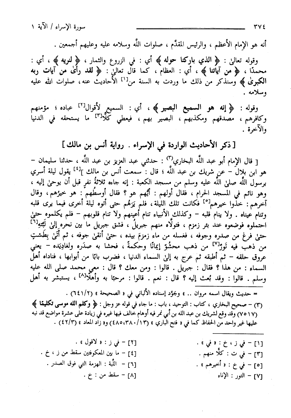 " ذِكْر الْأَحَادِيث الْوَارِدَة فِي الْإِسْرَاء : رِوَايَة أَنَس بْن مَالِك رَضِيَ اللَّه عَنْهُ " قَالَ الْإِمَام أَبُو عَبْد اللَّه الْبُخَارِيّ : حَدَّثَنِي عَبْد الْعَزِيز بْن عَبْد اللَّه حَدَّثَنَا سُلَيْمَان - هُوَ اِبْن بِلَال - عَنْ شَرِيك بْن عَبْد اللَّه قَالَ : سَمِعْت أَنَس بْن مَالِك يَقُول لَيْلَة أُسْرِيَ بِرَسُولِ اللَّه صَلَّى اللَّه عَلَيْهِ وَسَلَّمَ مِنْ مَسْجِد الْكَعْبَة أَنَّهُ جَاءَهُ ثَلَاثَة نَفَر قَبْل أَنْ يُوحَى إِلَيْهِ وَهُوَ نَائِم فِي الْمَسْجِد الْحَرَام فَقَالَ أَوَّلهمْ أَيّهمْ هُوَ ؟ فَقَالَ أَوْسَطهمْ هُوَ خَيْرهمْ فَقَالَ آخِرهمْ خُذُوا خَيْرهمْ فَكَانَتْ تِلْكَ اللَّيْلَة فَلَمْ يَرَهُمْ حَتَّى أَتَوْهُ لَيْلَة أُخْرَى فِيمَا يَرَى قَلْبه وَتَنَام عَيْنه وَلَا يَنَام قَلْبه - وَكَذَلِكَ الْأَنْبِيَاء تَنَام أَعْيُنهمْ وَلَا تَنَام قُلُوبهمْ - فَلَمْ يُكَلِّمُوهُ حَتَّى اِحْتَمَلُوهُ فَوَضَعُوهُ عِنْد بِئْر زَمْزَم فَتَوَلَّاهُ مِنْهُمْ جِبْرِيل فَشَقَّ جِبْرِيل مَا بَيْن نَحْره إِلَى لَبَّته حَتَّى فَرَغَ مِنْ صَدْره وَجَوْفه فَغَسَلَهُ مِنْ مَاء زَمْزَم بِيَدِهِ حَتَّى أَنْقَى جَوْفه ثُمَّ أَتَى بِطَسْتٍ مِنْ ذَهَب فِيهِ تَوْر مِنْ ذَهَب مَحْشُوّ إِيمَانًا وَحِكْمَة فَحَشَا بِهِ صَدْره وَلَغَادِيده - يَعْنِي عُرُوق حَلْقه - ثُمَّ أَطْبَقَهُ ثُمَّ عَرَجَ بِهِ إِلَى السَّمَاء الدُّنْيَا فَضَرَبَ بَابًا مِنْ أَبْوَابهَا فَنَادَاهُ أَهْل السَّمَاء مَنْ هَذَا ؟ فَقَالَ جِبْرِيل قَالُوا وَمَنْ مَعَك ؟ قَالَ مَعِي مُحَمَّد قَالُوا وَقَدْ بُعِثَ إِلَيْهِ ؟ قَالَ نَعَمْ قَالُوا فَمَرْحَبًا بِهِ وَأَهْلًا يَسْتَبْشِر بِهِ أَهْل