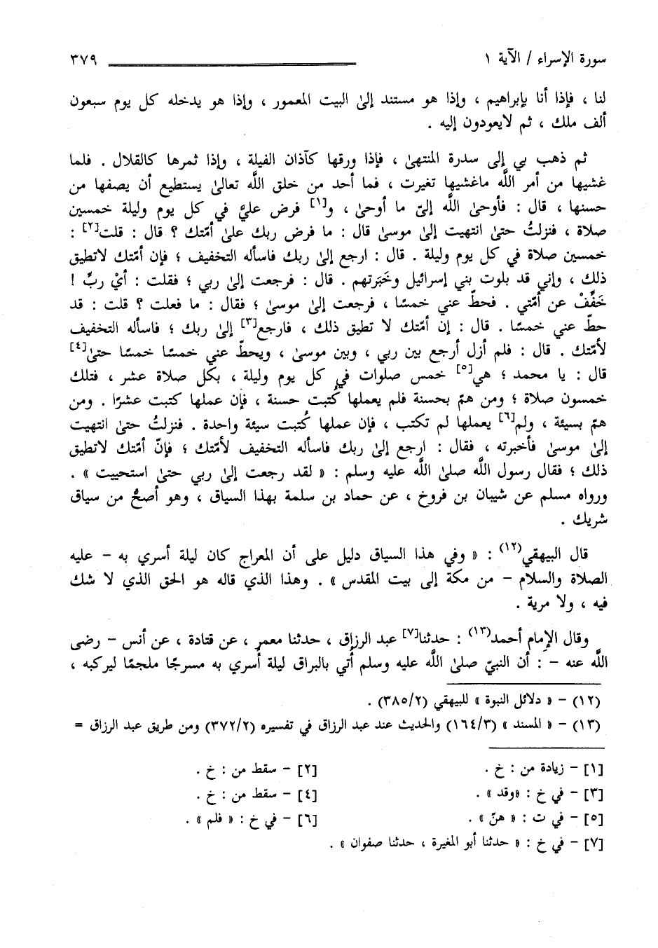 لَنَا فَإِذَا أَنَا بِإِبْرَاهِيم عَلَيْهِ السَّلَام وَإِذَا هُوَ مُسْتَنِد إِلَى الْبَيْت الْمَعْمُور وَإِذَا هُوَ يَدْخُلهُ كُلّ يَوْم سَبْعُونَ أَلْف مَلَك ثُمَّ لَا يَعُودُونَ إِلَيْهِ ثُمَّ ذَهَبَ بِي إِلَى سِدْرَة الْمُنْتَهَى فَإِذَا وَرَقهَا كَآذَانِ الْفِيلَة وَإِذَا ثَمَرهَا كَالْقِلَالِ فَلَمَّا غَشِيَهَا مِنْ أَمْر اللَّه مَا غَشِيَهَا تَغَيَّرَتْ فَمَا أَحَد مِنْ خَلْق اللَّه تَعَالَى يَسْتَطِيع أَنْ يَصِفهَا مِنْ حُسْنهَا قَالَ فَأَوْحَى اللَّه إِلَيَّ مَا أَوْحَى وَقَدْ فَرَضَ عَلَيَّ فِي كُلّ يَوْم وَلَيْلَة خَمْسِينَ صَلَاة فَنَزَلْت حَتَّى اِنْتَهَيْت إِلَى مُوسَى قَالَ مَا فَرَضَ رَبّك عَلَى أُمَّتك ؟ قُلْت خَمْسِينَ صَلَاة فِي كُلّ يَوْم وَلَيْلَة قَالَ اِرْجِعْ إِلَى رَبّك فَاسْأَلْهُ التَّخْفِيف لِأُمَّتِك فَإِنَّ أُمَّتك لَا تُطِيق ذَلِكَ وَإِنِّي قَدْ بَلَوْت بَنِي إِسْرَائِيل وَخَبَرْتهمْ قَالَ فَرَجَعْت إِلَى رَبِّي فَقُلْت أَيْ رَبّ خَفِّفْ عَنْ أُمَّتِي فَحَطَّ عَنِّي خَمْسًا فَنَزَلْت حَتَّى اِنْتَهَيْت إِلَى مُوسَى فَقَالَ مَا فَعَلْت فَقُلْت قَدْ حَطَّ عَنِّي خَمْسًا فَقَالَ إِنَّ أُمَّتك لَا تُطِيق ذَلِكَ فَارْجِعْ إِلَى رَبّك فَاسْأَلْهُ التَّخْفِيف لِأُمَّتِك قَالَ فَلَمْ أَزَلْ أَرْجِع بَيْن رَبِّي وَبَيْن مُوسَى وَيَحُطّ عَنِّي خَمْسًا خَمْسًا حَتَّى قَالَ : يَا مُحَمَّد هُنَّ خَمْس صَلَوَات فِي كُلّ يَوْم وَلَيْلَة بِكُلِّ صَلَاة عَشْر فَتِلْكَ خَمْسُونَ صَلَاة وَمَنْ هَمَّ بِحَسَنَةٍ فَلَمْ يَعْمَلهَا كُتِبَتْ لَهُ حَسَنَة فَإِنْ عَمِلَهَا كُتِبَتْ عَشْرًا وَمَنْ هَمَّ بِسَيِّئَةٍ فَلَمْ يَعْمَلهَا لَمْ تُكْتَب فَإِنْ عَمِلَهَا كُتِبَتْ سَيِّئَة وَاحِدَة .