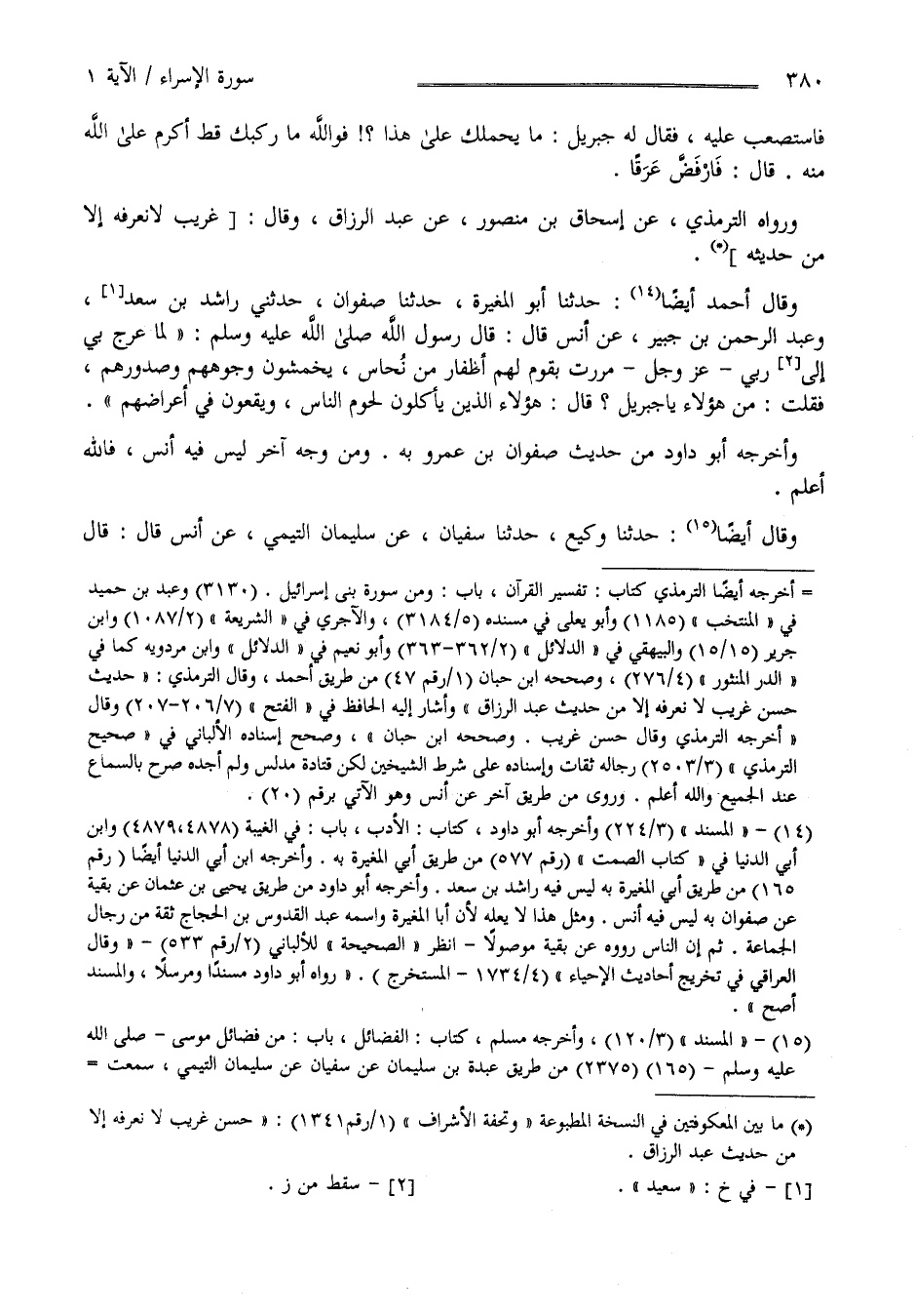 فَاسْتَصْعَبَ عَلَيْهِ فَقَالَ لَهُ جِبْرِيل مَا يَحْمِلك عَلَى هَذَا فَوَاَللَّهِ مَا رَكِبَك قَطُّ أَكْرَم عَلَى اللَّه مِنْهُ قَالَ فَارْفَضَّ عَرَقًا وَرَوَاهُ التِّرْمِذِيّ عَنْ إِسْحَاق بْن مَنْصُور عَنْ عَبْد الرَّزَّاق وَقَالَ غَرِيب لَا نَعْرِفهُ إِلَّا مِنْ حَدِيثه .