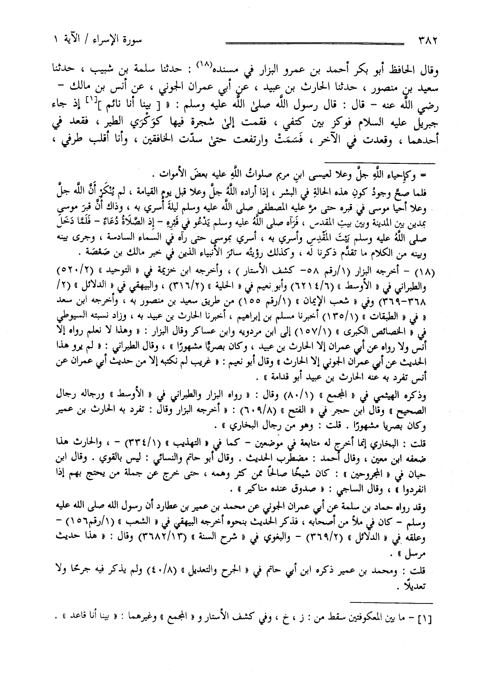 وَقَالَ الْحَافِظ أَبُو بَكْر أَحْمَد بْن عَمْرو الْبَزَّار فِي مُسْنَده حَدَّثَنَا سَلَمَة بْن شَبِيب حَدَّثَنَا سَعِيد بْن مَنْصُور حَدَّثَنَا الْحَارِث بْن عُبَيْد عَنْ أَبِي عِمْرَان الْجَوْنِيّ عَنْ أَنَس بْن مَالِك رَضِيَ اللَّه عَنْهُ قَالَ قَالَ رَسُول اللَّه صَلَّى اللَّه عَلَيْهِ وَسَلَّمَ " بَيْنَا أَنَا نَائِم إِذْ جَاءَ جِبْرِيل عَلَيْهِ السَّلَام فَوَكَزَ بَيْن كَتِفَيَّ فَقُمْت إِلَى شَجَرَة فِيهَا كَوَكْرَيْ الطَّيْر فَقَعَدَ فِي أَحَدهمَا وَقَعَدْت فِي الْآخَر فَسَمَتْ وَارْتَفَعَتْ حَتَّى سَدَّتْ الْخَافِقَيْنِ وَأَنَا أُقَلِّب طَرْفِي