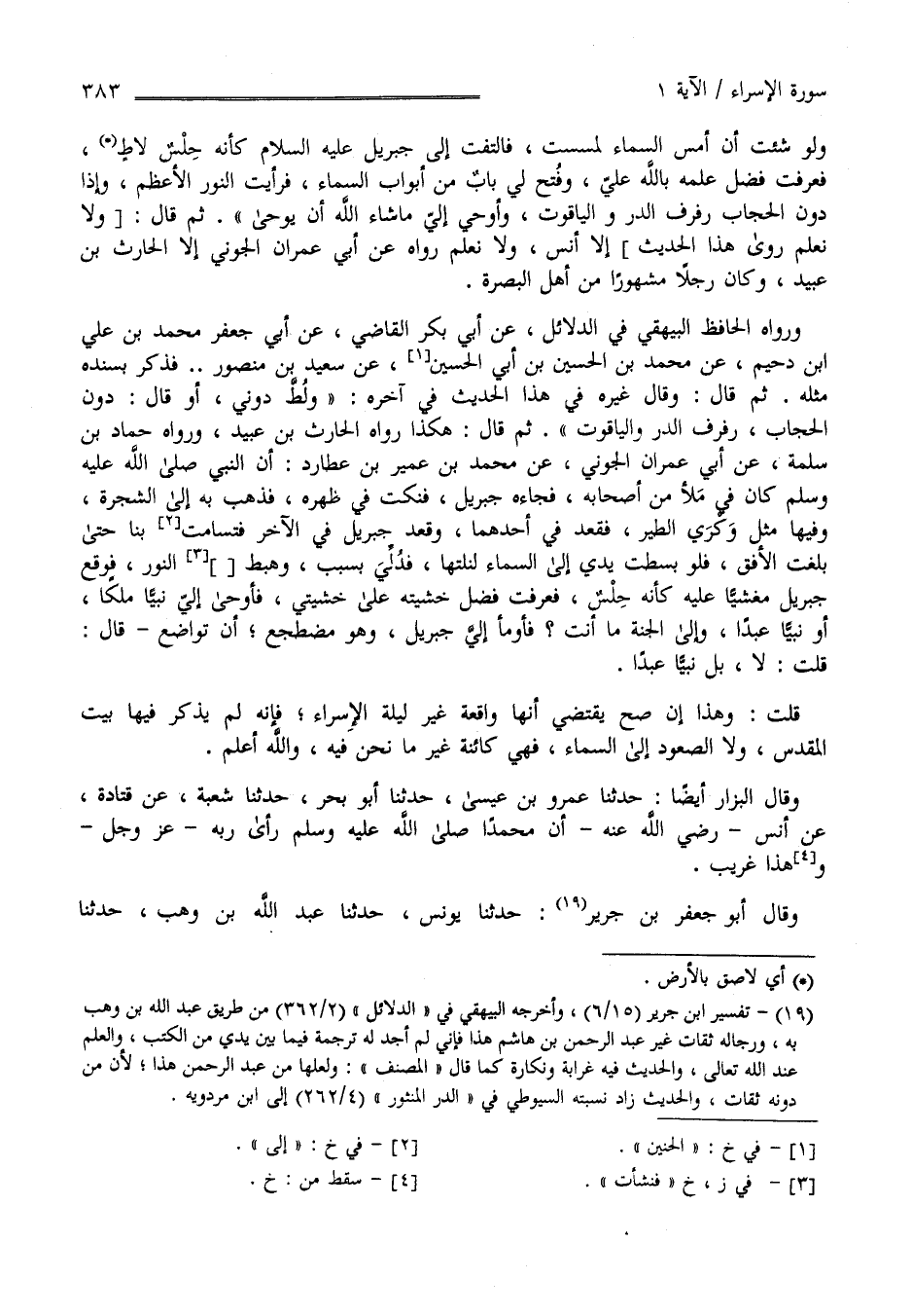 وَرَوَاهُ الْحَافِظ الْبَيْهَقِيّ فِي الدَّلَائِل عَنْ أَبِي بَكْر الْقَاضِي عَنْ أَبِي جَعْفَر مُحَمَّد بْن عَلِيّ بْن دُحَيْم عَنْ مُحَمَّد بْن الْحُسَيْن بْن أَبِي الْحُسَيْن عَنْ سَعِيد بْن مَنْصُور فَذَكَرَهُ بِسَنَدِهِ مِثْله ثُمَّ قَالَ وَقَالَ غَيْره فِي هَذَا الْحَدِيث فِي آخِره وَلَطَّ دُونِي أَوْ قَالَ دُون الْحِجَاب رَفْرَف الدُّرّ وَالْيَاقُوت ثُمَّ قَالَ هَكَذَا رَوَاهُ الْحَارِث بْن عُبَيْد وَرَوَاهُ حَمَّاد بْن سَلَمَة عَنْ أَبِي عِمْرَان الْجَوْنِيّ عَنْ مُحَمَّد بْن عُمَيْر بْن عُطَارِد أَنَّ النَّبِيّ صَلَّى اللَّه عَلَيْهِ وَسَلَّمَ كَانَ فِي مَلَإٍ مِنْ أَصْحَابه فَجَاءَهُ جِبْرِيل فَنَكَتَ فِي ظَهْره فَذَهَبَ بِهِ إِلَى الشَّجَرَة وَفِيهَا مِثْل وَكْرَيْ الطَّيْر فَقَعَدَ فِي أَحَدهمَا وَقَعَدَ جِبْرِيل فِي الْآخَر " فَنَشَأَتْ بِنَا حَتَّى بَلَغَتْ الْأُفُق فَلَوْ بَسَطْت يَدَيَّ إِلَى السَّمَاء لَنِلْتهَا فَدُلِّيَ بِسَبَبٍ وَهَبَطَ إِلَيَّ النُّور فَوَقَعَ جِبْرِيل مَغْشِيًّا عَلَيْهِ كَأَنَّهُ حِلْس فَعَرَفْت فَضْل خَشْيَته عَلَى خَشْيَتِي فَأُوحِيَ إِلَيَّ نَبِيًّا مَلَكًا أَوْ نَبِيًّا عَبْدًا وَإِلَى الْجَنَّة مَا أَنْتَ فَأَوْمَأَ إِلَيَّ جِبْرِيل وَهُوَ مُضْطَجِع أَنْ تَوَاضَعْ قَالَ قُلْت لَا بَلْ نَبِيًّا عَبْدًا " قُلْت وَهَذَا إِنْ صَحَّ يَقْتَضِي أَنَّهَا وَاقِعَة غَيْر لَيْلَة الْإِسْرَاء فَإِنَّهُ لَمْ يَذْكُر فِيهَا بَيْت الْمَقْدِس وَلَا الصُّعُود إِلَى السَّمَاء فَهِيَ كَائِنَة غَيْر مَا نَحْنُ فِيهِ وَاَللَّه أَعْلَم.