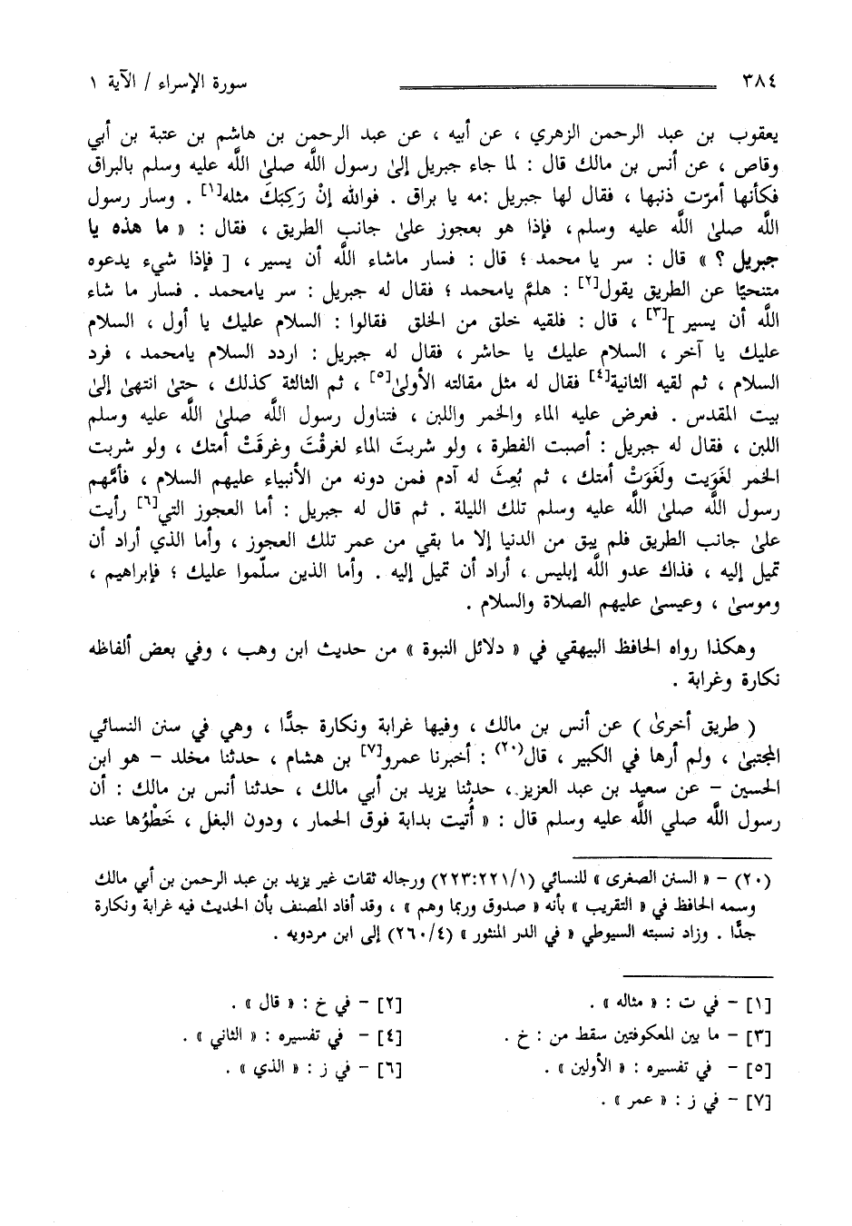 يَعْقُوب بْن عَبْد الرَّحْمَن الزُّهْرِيّ عَنْ أَبِيهِ عَنْ عَبْد الرَّحْمَن بْن هَاشِم بْن عُتْبَة بْن أَبِي وَقَّاص عَنْ أَنَس بْن مَالِك قَالَ : لَمَّا جَاءَ جِبْرِيل إِلَى رَسُول اللَّه صَلَّى اللَّه عَلَيْهِ وَسَلَّمَ بِالْبُرَاقِ فَكَأَنَّهَا حَرَّكَتْ ذَنَبهَا فَقَالَ لَهَا جِبْرِيل مَهْ يَا بُرَاق فَوَاَللَّهِ مَا رَكِبَك مِثْله وَسَارَ رَسُول اللَّه صَلَّى اللَّه عَلَيْهِ وَسَلَّمَ فَإِذَا هُوَ بِعَجُوزٍ عَلَى جَانِب الطَّرِيق فَقَالَ " مَا هَذِهِ يَا جِبْرِيل ؟ قَالَ سِرْ يَا مُحَمَّد قَالَ فَسَارَ مَا شَاءَ اللَّه أَنْ يَسِير فَإِذَا شَيْء يَدْعُوهُ مُتَنَحِّيًا عَنْ الطَّرِيق فَقَالَ هَلُمَّ يَا مُحَمَّد فَقَالَ لَهُ جِبْرِيل سِرْ يَا مُحَمَّد فَسَارَ مَا شَاءَ اللَّه أَنْ يَسِير قَالَ فَلَقِيَهُ خَلْق مِنْ خَلْق اللَّه فَقَالُوا السَّلَام عَلَيْك يَا أَوَّل السَّلَام عَلَيْك يَا آخِر السَّلَام عَلَيْك يَا حَاشِر فَقَالَ لَهُ جِبْرِيل اُرْدُدْ السَّلَام يَا مُحَمَّد فَرَدَّ السَّلَام ثُمَّ لَقِيَهُ الثَّانِيَة فَقَالَ لَهُ مِثْل مَقَالَته الْأُولَى ثُمَّ الثَّالِثَة كَذَلِكَ حَتَّى اِنْتَهَى إِلَى بَيْت الْمَقْدِس فَعُرِضَ عَلَيْهِ الْخَمْر وَالْمَاء وَاللَّبَن فَتَنَاوَلَ رَسُول اللَّه صَلَّى اللَّه عَلَيْهِ وَسَلَّمَ اللَّبَن فَقَالَ لَهُ جِبْرِيل أَصَبْت الْفِطْرَة وَلَوْ شَرِبْت الْمَاء لَغَرِقْت وَغَرِقَتْ أُمَّتك وَلَوْ شَرِبْت الْخَمْر لَغَوَيْت وَلَغَوَتْ أُمَّتك ثُمَّ بَعَثَ لَهُ آدَم فَمَنْ دُونه مِنْ الْأَنْبِيَاء عَلَيْهِمْ السَّلَام فَأَمَّهُمْ رَسُول اللَّه صَلَّى اللَّه عَلَيْهِ وَسَلَّمَ تِلْكَ اللَّيْلَة ثُمَّ قَالَ لَهُ جِبْرِيل : أَمَّا الْعَجُوز الَّتِي رَأَيْت عَلَى جَانِب الطَّرِيق فَلَمْ يَبْقَ مِنْ الدُّنْيَا إِلَّا كَمَا بَقِيَ مِنْ عُمُر تِلْكَ الْعَجُوز وَأَمَّا الَّذِي أَرَادَ أَنْ تَمِيل إِلَيْهِ فَذَاكَ عَدُوّ اللَّه إِبْلِيس أَرَادَ أَنْ تَمِيل إِلَيْهِ وَأَمَّا الَّذِينَ سَلَّمُوا عَلَيْك فَإِبْرَاهِيم وَمُوسَى وَعِيسَى عَلَيْهِمْ السَّلَام وَهَكَذَا رَوَاهُ الْحَافِظ الْبَيْهَقِيّ فِي دَلَائِل النُّبُوَّة مِنْ حَدِيث اِبْن وَهْب وَفِي بَعْض أَلْفَاظه نَكَارَة وَغَرَابَة " طَرِيق أُخْرَى " عَنْ أَنَس بْن مَالِك وَفِيهَا غَرَابَة وَنَكَارَة جِدًّا وَهِيَ فِي سُنَن النَّسَائِيّ الْمُجْتَبَى وَلَمْ أَرَهَا فِي الْكَبِير قَالَ : حَدَّثَنَا عَمْرو بْن هِشَام حَدَّثَنَا مَخْلَد هُوَ اِبْن الْحُسَيْن عَنْ سَعِيد بْن عَبْد الْعَزِيز حَدَّثَنَا يَزِيد بْن أَبِي مَالِك حَدَّثَنَا أَنَس بْن مَالِك أَنَّ رَسُول اللَّه صَلَّى اللَّه عَلَيْهِ وَسَلَّمَ قَالَ " أُتِيت بِدَابَّةٍ فَوْق الْحِمَار وَدُون الْبَغْل خَطْوهَا عِنْد