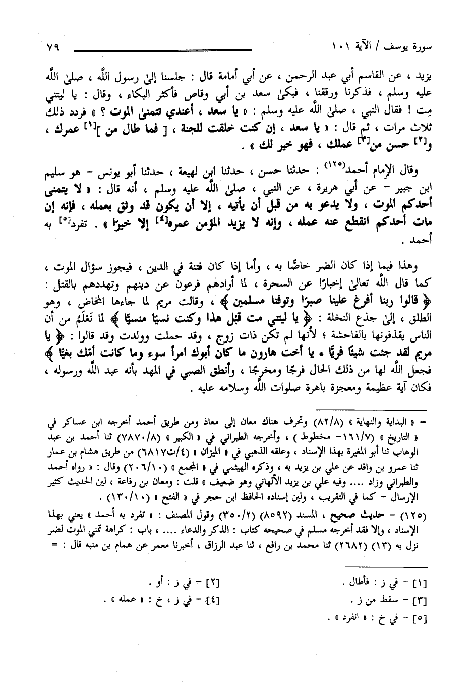 فَأَكْثَر الْبُكَاء وَقَالَ يَا لَيْتَنِي مِتّ فَقَالَ النَّبِيّ صَلَّى اللَّه عَلَيْهِ وَسَلَّمَ يَا سَعْد أَعِنْدِي تَتَمَنَّى الْمَوْت ؟ فَرَدَّدَ ذَلِكَ ثَلَاث مَرَّات ثُمَّ قَالَ يَا سَعْد إِنْ كُنْت خُلِقْت لِلْجَنَّةِ فَمَا طَالَ مِنْ عُمُرك وَحَسُنَ مِنْ عَمَلِك فَهُوَ خَيْر لَك وَقَالَ الْإِمَام أَحْمَد حَدَّثَنَا حَسَن حَدَّثَنَا اِبْن لَهِيعَة حَدَّثَنَا أَبُو يُونُس هُوَ مُسْلِم بْن جُبَيْر عَنْ أَبِي هُرَيْرَة عَنْ النَّبِيّ صَلَّى اللَّه عَلَيْهِ وَسَلَّمَ أَنَّهُ قَالَ لَا يَتَمَنَّيَنَّ أَحَدكُمْ الْمَوْت لِضُرٍّ نَزَلَ بِهِ وَلَا يَدْعُ بِهِ مِنْ قَبْل أَنْ يَأْتِيَهُ إِلَّا أَنْ يَكُون قَدْ وَثِقَ بِعَمَلِهِ فَإِنَّهُ إِذَا مَاتَ أَحَدكُمْ اِنْقَطَعَ عَنْهُ عَمَله لِأَنَّهُ لَا يَزِيد الْمُؤْمِن عَمَله إِلَّا خَيْرًا تَفَرَّدَ بِهِ أَحْمَد وَهَذَا فِيمَا إِذَا كَانَ الضُّرّ خَاصًّا بِهِ وَأَمَّا إِذَا كَانَ فِتْنَة فِي الدِّين فَيَجُوز سُؤَال الْمَوْت كَمَا قَالَ اللَّه تَعَالَى إِخْبَارًا عَنْ السَّحَرَة لَمَّا أَرَادَهُمْ فِرْعَوْن عَنْ دِينهمْ وَتَهَدَّدَهُمْ بِالْقَتْلِ " قَالُوا رَبّنَا أَفْرِغْ عَلَيْنَا صَبْرًا وَتَوَفَّنَا مُسْلِمِينَ " وَقَالَتْ مَرْيَم لَمَّا جَاءَهَا الْمَخَاض وَهُوَ الطَّلْق إِلَى جِذْع النَّخْلَة " يَا لَيْتَنِي مِتّ قَبْل هَذَا وَكُنْت نَسْيًا مَنْسِيًّا " لِمَا عَلِمَتْ مِنْ أَنَّ النَّاس يَقْذِفُونَهَا بِالْفَاحِشَةِ لِأَنَّهَا لَمْ تَكُنْ ذَات زَوْج وَقَدْ حَمَلَتْ وَوَضَعَتْ وَقَدْ قَالُوا " يَا مَرْيَم لَقَدْ جِئْت شَيْئًا فَرِيًّا يَا أُخْت هَارُون مَا كَانَ أَبُوك اِمْرَأَ سَوْء وَمَا كَانَتْ أُمّك بَغِيًّا " فَجَعَلَ اللَّه لَهَا مِنْ ذَلِكَ الْحَال فَرَجًا وَمَخْرَجًا وَأَنْطَقَ الصَّبِيّ فِي الْمَهْد بِأَنَّهُ عَبْد اللَّه وَرَسُوله فَكَانَ آيَة عَظِيمَة وَمُعْجِزَة بَاهِرَة صَلَوَات اللَّه وَسَلَامه عَلَيْهِ