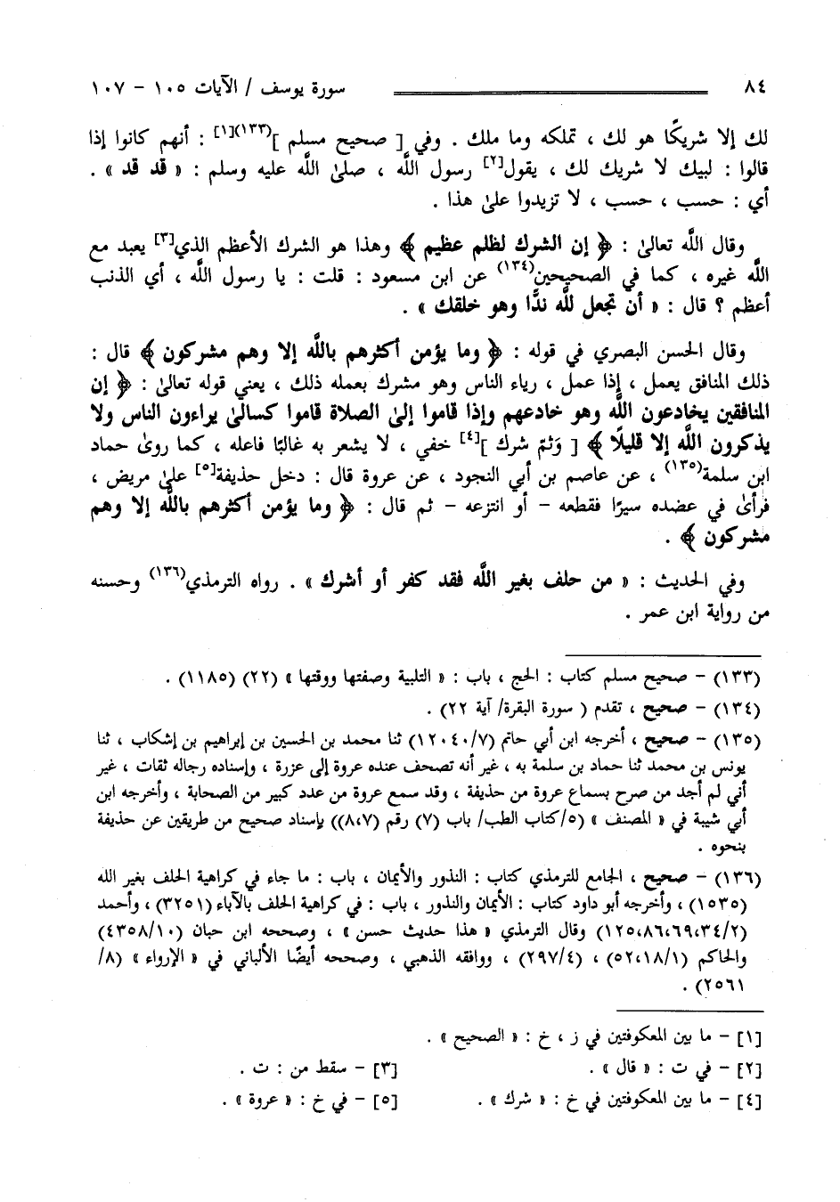 لَك إِلَّا شَرِيك هُوَ لَك تَمْلِكهُ وَمَا مَلَك وَفِي صَحِيح مُسْلِم أَنَّهُمْ كَانُوا إِذَا قَالُوا لَبَّيْكَ لَا شَرِيك لَك قَالَ رَسُول اللَّه صَلَّى اللَّه عَلَيْهِ وَسَلَّمَ قَدْ قَدْ أَيْ حَسْب حَسْب لَا تَزِيدُوا عَلَى هَذَا , وَقَالَ اللَّه تَعَالَى " إِنَّ الشِّرْك لَظُلْم عَظِيم" وَهَذَا هُوَ الشِّرْك الْأَعْظَم يُعْبَد مَعَ اللَّه غَيْره كَمَا فِي الصَّحِيحَيْنِ عَنْ اِبْن مَسْعُود قُلْت يَا رَسُول اللَّه : أَيّ الذَّنْب أَعْظَم ؟ قَالَ أَنْ تَجْعَل لِلَّهِ نِدًّا وَهُوَ خَلَقَك وَقَالَ الْحَسَن الْبَصْرِيّ فِي قَوْله " وَمَا يُؤْمِن أَكْثَرهمْ بِاَللَّهِ إِلَّا وَهُمْ مُشْرِكُونَ " قَالَ ذَلِكَ الْمُنَافِق يَعْمَل إِذَا عَمِلَ رِيَاء النَّاس وَهُوَ مُشْرِك بِعَمَلِهِ ذَلِكَ يَعْنِي قَوْله تَعَالَى " إِنَّ الْمُنَافِقِينَ يُخَادِعُونَ اللَّه وَهُوَ خَادِعهمْ وَإِذَا قَامُوا إِلَى الصَّلَاة قَامُوا كُسَالَى يُرَاءُونَ النَّاس وَلَا يَذْكُرُونَ اللَّه إِلَّا قَلِيلًا " وَثَمَّ شِرْك آخَر خَفِيّ لَا يَشْعُر بِهِ غَالِبًا فَاعِله كَمَا رَوَى حَمَّاد بْن سَلَمَة عَنْ عَاصِم بْن أَبِي النَّجُود عَنْ عُرْوَة قَالَ : دَخَلَ حُذَيْفَة عَلَى مَرِيض فَرَأَى فِي عَضُده سَيْرًا فَقَطَعَهُ أَوْ اِنْتَزَعَهُ ثُمَّ قَالَ " وَمَا يُؤْمِن أَكْثَرهمْ بِاَللَّهِ إِلَّا وَهُمْ مُشْرِكُونَ" وَفِي الْحَدِيث مَنْ حَلَفَ بِغَيْرِ اللَّه فَقَدْ أَشْرَكَ رَوَاهُ التِّرْمِذِيّ وَحَسَّنَهُ مِنْ رِوَايَة اِبْن عُمَر