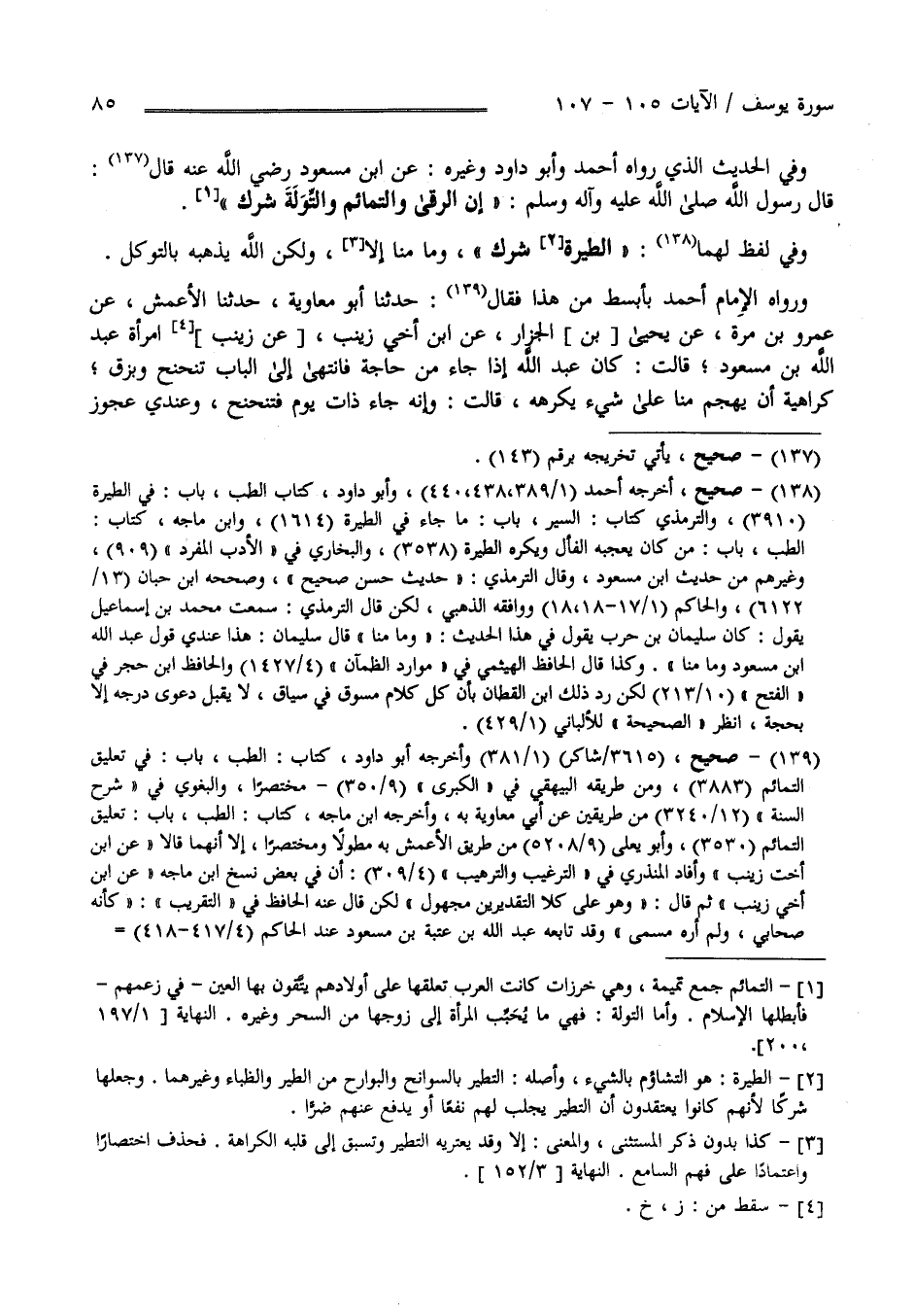 وَفِي الْحَدِيث الَّذِي رَوَاهُ أَحْمَد وَأَبُو دَاوُدَ وَغَيْره عَنْ اِبْن مَسْعُود رَضِيَ اللَّه عَنْهُ قَالَ : قَالَ رَسُول اللَّه صَلَّى اللَّه عَلَيْهِ وَآلِهِ وَسَلَّمَ إِنَّ الرُّقَى وَالتَّمَائِم وَالتِّوَلَة شِرْك وَفِي لَفْظ لَهُمَا الطِّيَرَة شِرْك وَمَا مِنَّا إِلَّا وَلَكِنَّ اللَّه يُذْهِبهُ بِالتَّوَكُّلِ وَرَوَاهُ الْإِمَام أَحْمَد بِأَبْسَط مِنْ هَذَا فَقَالَ حَدَّثَنَا أَبُو مُعَاوِيَة حَدَّثَنَا الْأَعْمَش عَنْ عَمْرو بْن مُرَّة عَنْ يَحْيَى الْجَزَّار عَنْ اِبْن أَخِي زَيْنَب عَنْ زَيْنَب اِمْرَأَة عَبْد اللَّه بْن مَسْعُود قَالَتْ : كَانَ عَبْد اللَّه إِذَا جَاءَ مِنْ حَاجَة فَانْتَهَى إِلَى الْبَاب تَنَحْنَحَ وَبَزَقَ كَرَاهَة أَنْ يَهْجُم مِنَّا عَلَى أَمْر يَكْرَههُ قَالَتْ لِأَنَّهُ جَاءَ ذَات يَوْم فَتَنَحْنَحَ وَعِنْدِي عَجُوز