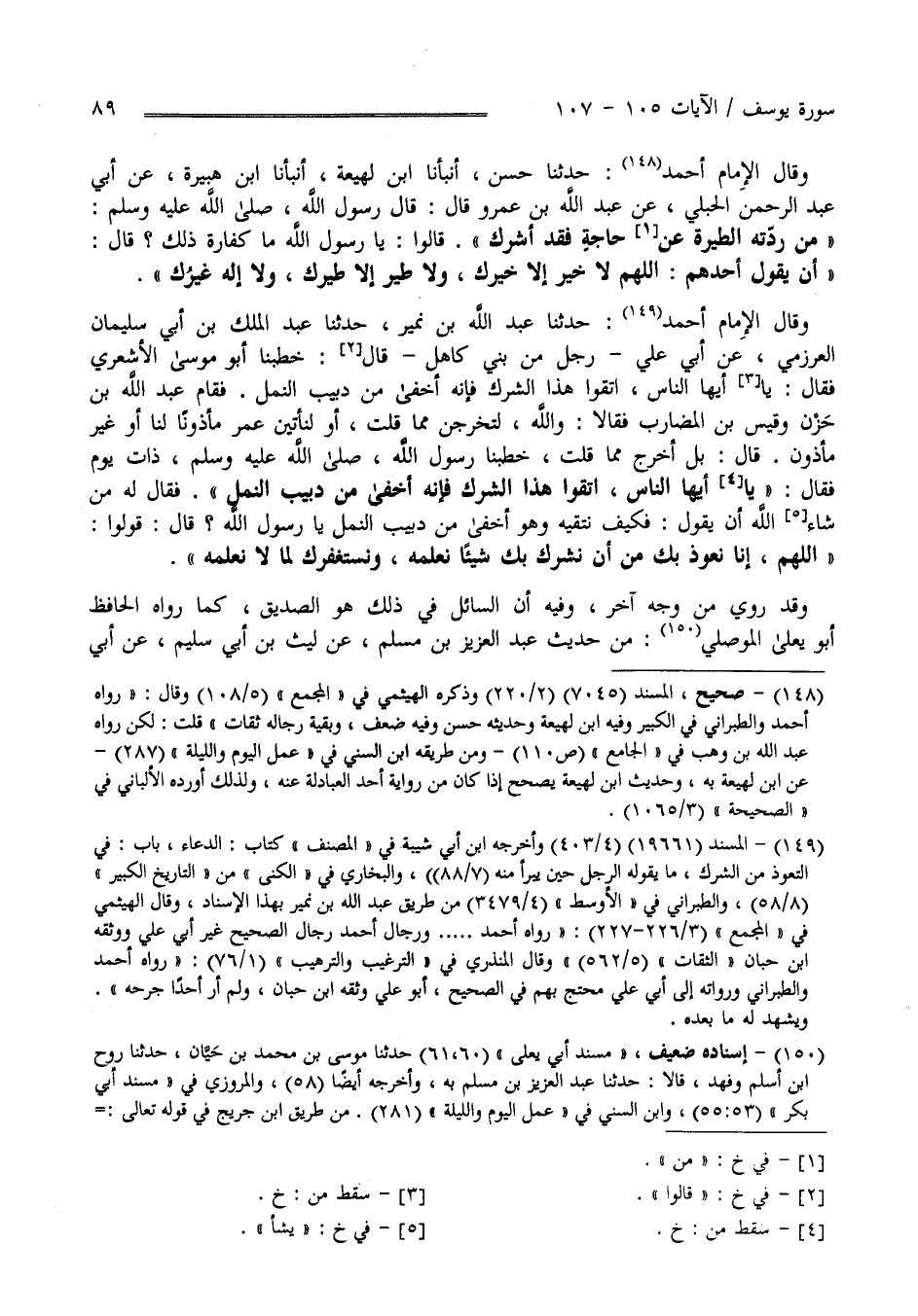 وَقَالَ الْإِمَام أَحْمَد حَدَّثَنَا حَسَن أَنْبَأَنَا اِبْن لَهِيعَة أَنْبَأَنَا اِبْن هُبَيْرَة عَنْ أَبِي عَبْد الرَّحْمَن الْحُبُلِيّ عَنْ عَبْد اللَّه بْن عَمْرو قَالَ : قَالَ رَسُول اللَّه صَلَّى اللَّه عَلَيْهِ وَسَلَّمَ مَنْ رَدَّتْهُ الطِّيَرَة عَنْ حَاجَته فَقَدْ أَشْرَكَ قَالُوا يَا رَسُول اللَّه مَا كَفَّارَة ذَلِكَ ؟ قَالَ أَنْ يَقُول أَحَدهمْ اللَّهُمَّ لَا خَيْر إِلَّا خَيْرك وَلَا طَيْر إِلَّا طَيْرك وَلَا إِلَه غَيْرك وَقَالَ الْإِمَام أَحْمَد حَدَّثَنَا عَبْد اللَّه بْن نُمَيْر حَدَّثَنَا عَبْد الْمَلِك بْن أَبِي سُلَيْمَان الْعَرْزَمِيّ عَنْ أَبِي عَلِيّ رَجُل مِنْ بَنِي كَاهِل قَالَ : خَطَبَنَا