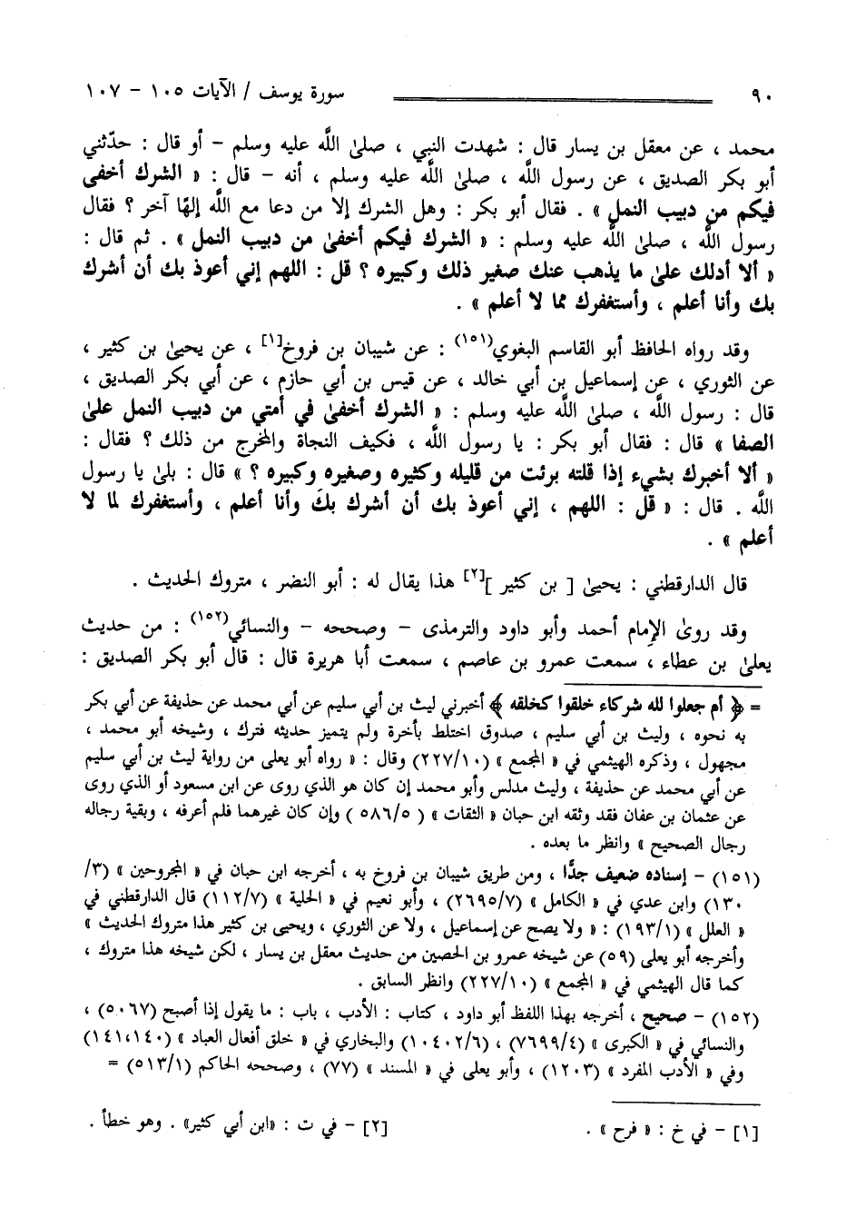 مُحَمَّد عَنْ مَعْقِل بْن يَسَار قَالَ شَهِدْت النَّبِيّ صَلَّى اللَّه عَلَيْهِ وَسَلَّمَ أَوْ قَالَ حَدَّثَنِي أَبُو بَكْر الصِّدِّيق عَنْ رَسُول اللَّه صَلَّى اللَّه عَلَيْهِ وَسَلَّمَ أَنَّهُ قَالَ الشِّرْك أَخْفَى فِيكُمْ مِنْ دَبِيب النَّمْل فَقَالَ أَبُو بَكْر وَهَلْ الشِّرْك إِلَّا مَنْ دَعَا مَعَ اللَّه إِلَهًا آخَر ؟ فَقَالَ رَسُول اللَّه صَلَّى اللَّه عَلَيْهِ وَسَلَّمَ الشِّرْك فِيكُمْ أَخْفَى مِنْ دَبِيب النَّمْل ثُمَّ قَالَ أَلَا أَدُلّكُمْ عَلَى مَا يُذْهِب عَنْك صَغِير ذَلِكَ وَكَبِيره ؟ قُلْ اللَّهُمَّ إِنِّي أَعُوذ بِك أَنْ أُشْرِك بِك وَأَنَا أَعْلَم وَأَسْتَغْفِرك مِمَّا لَا أَعْلَم وَقَدْ رَوَاهُ الْحَافِظ أَبُو الْقَاسِم الْبَغَوِيّ عَنْ شَيْبَان بْن فَرُّوخ عَنْ يَحْيَى بْن أَبِي كَثِير عَنْ الثَّوْرِيّ عَنْ إِسْمَاعِيل بْن أَبِي خَالِد عَنْ قَيْس بْن أَبِي حَازِم عَنْ أَبِي بَكْر الصِّدِّيق قَالَ : قَالَ رَسُول اللَّه صَلَّى اللَّه عَلَيْهِ وَسَلَّمَ الشِّرْك أَخْفَى فِي أُمَّتِي مِنْ دَبِيب النَّمْل عَلَى الصَّفَا قَالَ : فَقَالَ أَبُو بَكْر يَا رَسُول اللَّه فَكَيْف النَّجَاة وَالْمَخْرَج مِنْ ذَلِكَ ؟ فَقَالَ أَلَا أُخْبِرك بِشَيْءٍ إِذَا قُلْته بَرِئْت مِنْ قَلِيله وَكَثِيره وَصَغِيره وَكَبِيره ؟ قَالَ بَلَى يَا رَسُول اللَّه قَالَ : قُلْ اللَّهُمَّ إِنِّي أَعُوذ بِك أَنْ أُشْرِك بِك وَأَنَا أَعْلَم وَأَسْتَغْفِرك لِمَا لَا أَعْلَم قَالَ الدَّارَقُطْنِيّ يَحْيَى بْن أَبِي كَثِير هَذَا يُقَال لَهُ أَبُو النَّضْر مَتْرُوك الْحَدِيث وَقَدْ رَوَى الْإِمَام أَحْمَد وَالتِّرْمِذِيّ وَصَحَّحَهُ وَالنَّسَائِيّ مِنْ حَدِيث يَعْلَى بْن عَطَاء سَمِعْت عَمْرو بْن عَاصِم سَمِعْت أَبَا هُرَيْرَة قَالَ أَبُو بَكْر الصِّدِّيق