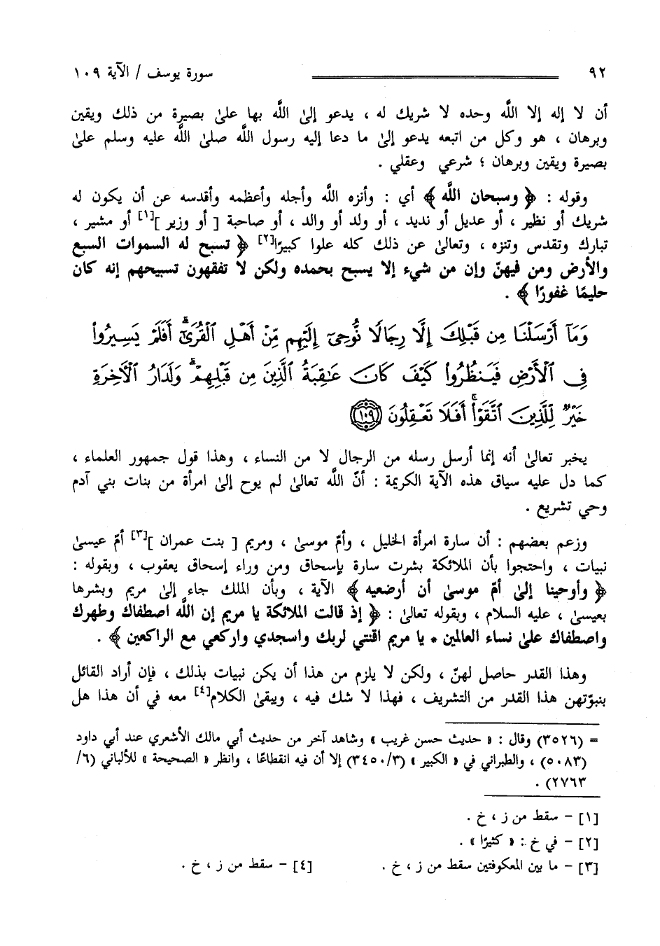 يُخْبِر تَعَالَى أَنَّهُ إِنَّمَا أَرْسَلَ رُسُله مِنْ الرِّجَال لَا مِنْ النِّسَاء وَهَذَا قَوْل جُمْهُور الْعُلَمَاء كَمَا دَلَّ عَلَيْهِ سِيَاق هَذِهِ الْآيَة الْكَرِيمَة إِنَّ اللَّه تَعَالَى لَمْ يُوحِ إِلَى اِمْرَأَة مِنْ بَنَات بَنِي آدَم وَحْي تَشْرِيع وَزَعَمَ بَعْضهمْ أَنَّ سَارَّة اِمْرَأَة الْخَلِيل وَأُمّ مُوسَى وَمَرْيَم بِنْت عِمْرَان أُمّ عِيسَى نَبِيَّات وَاحْتَجُّوا بِأَنَّ الْمَلَائِكَة بَشَّرَتْ سَارَّة بِإِسْحَاق وَمِنْ وَرَاء إِسْحَاق يَعْقُوب وَبِقَوْلِهِ " وَأَوْحَيْنَا إِلَى أُمّ مُوسَى أَنْ أَرْضِعِيهِ" الْآيَة وَبِأَنَّ الْمَلَك جَاءَ إِلَى مَرْيَم وَبَشَّرَهَا بِعِيسَى عَلَيْهِ السَّلَام وَبِقَوْلِهِ تَعَالَى " إِذْ قَالَتْ الْمَلَائِكَة يَا مَرْيَم إِنَّ اللَّه اِصْطَفَاك وَطَهَّرَك وَاصْطَفَاك عَلَى نِسَاء الْعَالَمِينَ يَا مَرْيَم اُقْنُتِي لِرَبِّك وَاسْجُدِي وَارْكَعِي مَعَ الرَّاكِعِينَ " وَهَذَا الْقَدْر حَاصِل لَهُنَّ وَلَكِنْ لَا يَلْزَم مِنْ هَذَا أَنْ يَكُنَّ نَبِيَّات بِذَلِكَ فَإِنْ أَرَادَ الْقَائِل بِنُبُوَّتِهِنَّ هَذَا الْقَدْر مِنْ التَّشْرِيف فَهَذَا لَا شَكَّ فِيهِ وَيَبْقَى الْكَلَام مَعَهُ فِي أَنَّ هَذَا هَلْ