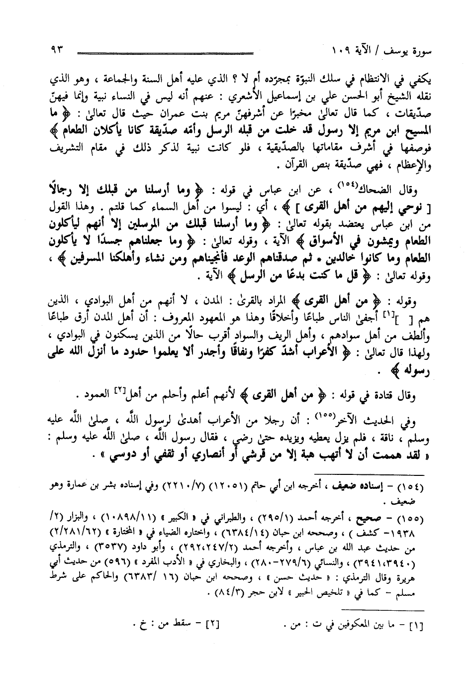 يَكْفِي فِي الِانْتِظَام فِي سِلْك النُّبُوَّة بِمُجَرَّدِهِ أَمْ لَا ؟ الَّذِي عَلَيْهِ أَهْل السُّنَّة وَالْجَمَاعَة وَهُوَ الَّذِي نَقَلَهُ الشَّيْخ أَبُو الْحَسَن عَلِيّ بْن إِسْمَاعِيل الْأَشْعَرِيّ عَنْهُمْ أَنَّهُ لَيْسَ فِي النِّسَاء نَبِيَّة وَإِنَّمَا فِيهِنَّ صِدِّيقَات كَمَا قَالَ تَعَالَى مُخْبِرًا عَنْ أَشْرَفهنَّ مَرْيَم بِنْت عِمْرَان حَيْثُ قَالَ تَعَالَى " مَا الْمَسِيح اِبْن مَرْيَم إِلَّا رَسُول قَدْ خَلَتْ مِنْ قَبْله الرُّسُل وَأُمّه صِدِّيقَة كَانَا يَأْكُلَانِ الطَّعَام" فَوَصَفَهَا فِي أَشْرَف مَقَامَاتهَا بِالصِّدِّيقَةِ فَلَوْ كَانَتْ نَبِيَّة لَذَكَرَ ذَلِكَ فِي مَقَام التَّشْرِيف وَالْإِعْظَام فَهِيَ صِدِّيقَة بِنَصّ الْقُرْآن وَقَالَ الضَّحَّاك عَنْ اِبْن عَبَّاس فِي قَوْله " وَمَا أَرْسَلْنَا مِنْ قَبْلِك إِلَّا رِجَالًا " الْآيَة أَيْ لَيْسُوا مِنْ أَهْل السَّمَاء كَمَا قُلْتُمْ وَهَذَا الْقَوْل مِنْ اِبْن عَبَّاس يَعْتَضِد بِقَوْلِهِ تَعَالَى " وَمَا أَرْسَلْنَا قَبْلَك مِنْ الْمُرْسَلِينَ إِلَّا إِنَّهُمْ لَيَأْكُلُونَ الطَّعَام وَيَمْشُونَ فِي الْأَسْوَاق " الْآيَة وَقَوْله تَعَالَى " وَمَا جَعَلْنَاهُمْ جَسَدًا لَا يَأْكُلُونَ الطَّعَام وَمَا كَانُوا خَالِدِينَ ثُمَّ صَدَقْنَاهُمْ الْوَعْد فَأَنْجَيْنَاهُمْ وَمَنْ نَشَاء وَأَهْلَكْنَا الْمُسْرِفِينَ" وَقَوْله تَعَالَى " قُلْ مَا كُنْت بِدْعًا مِنْ الرُّسُل " الْآيَة وَقَوْله مِنْ أَهْل الْقُرَى " الْمُرَاد بِالْقُرَى الْمُدُن لَا أَنَّهُمْ مِنْ أَهْل الْبَوَادِي الَّذِينَ هُمْ مِنْ أَجْفَى النَّاس طِبَاعًا وَأَخْلَاقًا وَهَذَا هُوَ الْمَعْهُود الْمَعْرُوف أَنَّ أَهْل الْمُدُن أَرَقّ طِبَاعًا وَأَلْطَف مِنْ أَهْل بِوَادِيهِمْ وَأَهْل الرِّيف وَالسَّوَاد أَقْرَب حَالًا مِنْ الَّذِينَ يَسْكُنُونَ فِي الْبَوَادِي وَلِهَذَا قَالَ تَعَالَى " الْأَعْرَاب أَشَدّ كُفْرًا وَنِفَاقًا " الْآيَة وَقَالَ قَتَادَة فِي قَوْله " مِنْ أَهْل الْقُرَى " لِأَنَّهُمْ أَعْلَم وَأَحْلُم مِنْ أَهْل الْعُمُور وَفِي الْحَدِيث الْآخَر أَنَّ رَجُلًا مِنْ الْأَعْرَاب أَهْدَى لِرَسُولِ اللَّه صَلَّى اللَّه عَلَيْهِ وَسَلَّمَ صَدَقَة