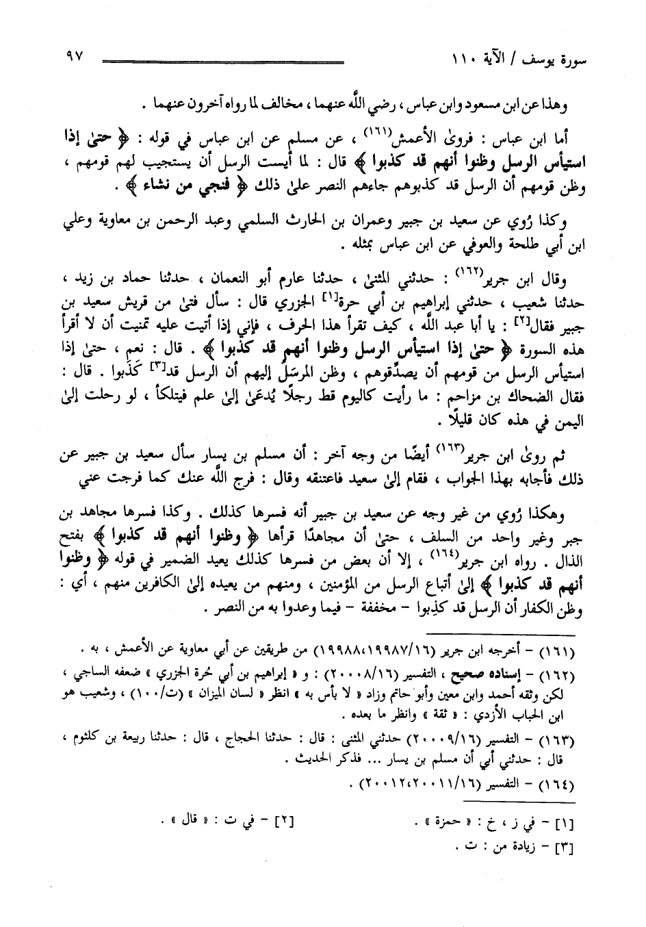 وَهَذَا عَنْ اِبْن عَبَّاس وَابْن مَسْعُود رَضِيَ اللَّه عَنْهُمَا مُخَالِف لِمَا رَوَاهُ آخَرُونَ عَنْهُمَا أَمَّا اِبْن عَبَّاس فَرَوَى الْأَعْمَش عَنْ مُسْلِم عَنْ اِبْن عَبَّاس فِي قَوْله " حَتَّى إِذَا اِسْتَيْأَسَ الرُّسُل وَظَنُّوا أَنَّهُمْ قَدْ كُذِبُوا " قَالَ لَمَّا أَيِسَتْ الرُّسُل أَنْ يَسْتَجِيب لَهُمْ قَوْمهمْ وَظَنَّ قَوْمهمْ أَنَّ الرُّسُل قَدْ كَذَّبُوهُمْ جَاءَهُمْ النَّصْر عَلَى ذَلِكَ " فَنُجِّيَ مَنْ نَشَاء " وَكَذَا رُوِيَ عَنْ سَعِيد بْن جُبَيْر وَعِمْرَان بْن الْحَارِث السُّلَمِيّ وَعَبْد الرَّحْمَن بْن مُعَاوِيَة وَعَلِيّ بْن أَبِي طَلْحَة وَالْعَوْفِيّ عَنْ اِبْن عَبَّاس بِمِثْلِهِ وَقَالَ اِبْن جَرِير حَدَّثَنِي الْمُثَنَّى حَدَّثَنَا عَارِم أَبُو النُّعْمَان حَدَّثَنَا حَمَّاد بْن زَيْد حَدَّثَنَا شُعَيْب حَدَّثَنَا إِبْرَاهِيم بْن أَبِي حَمْزَة الْجَزَرِيّ قَالَ : سَأَلَ فَتًى مِنْ قُرَيْش سَعِيد بْن جُبَيْر قَالَ أَخْبِرْنَا أَبَا عَبْد اللَّه كَيْف هَذَا الْحَرْف فَإِنِّي إِذَا أَتَيْت عَلَيْهِ تَمَنَّيْت أَنْ لَا أَقْرَأ هَذِهِ السُّورَة " حَتَّى إِذَا اِسْتَيْأَسَ الرُّسُل وَظَنُّوا أَنَّهُمْ قَدْ كُذِبُوا " قَالَ نَعَمْ حَتَّى إِذَا اِسْتَيْأَسَ الرُّسُل مِنْ قَوْمهمْ أَنْ يُصَدِّقُوهُمْ وَظَنَّ الْمُرْسَل إِلَيْهِمْ أَنْ الرُّسُل قَدْ كَذَبُوا فَقَالَ الضَّحَّاك بْن مُزَاحِم مَا رَأَيْت كَالْيَوْمِ قَطُّ رَجُل يُدْعَى إِلَى عِلْم فَيَتَلَكَّأ لَوْ رَحَلْت إِلَى الْيَمَن فِي هَذِهِ كَانَ قَلِيلًا ثُمَّ رَوَى اِبْن جَرِير أَيْضًا مِنْ وَجْه آخَر أَنَّ مُسْلِم بْن يَسَار سَأَلَ سَعِيد بْن جُبَيْر عَنْ ذَلِكَ فَأَجَابَهُ بِهَذَا الْجَوَاب فَقَامَ إِلَى سَعِيد فَاعْتَنَقَهُ وَقَالَ فَرَّجَ اللَّه عَنْك كَمَا فَرَّجْت عَنِّي وَهَكَذَا رُوِيَ مِنْ غَيْر وَجْه عَنْ سَعِيد بْن جُبَيْر أَنَّهُ فَسَّرَهَا كَذَلِكَ وَكَذَا فَسَّرَهَا مُجَاهِد بْن جَرِير وَغَيْر وَاحِد مِنْ السَّلَف حَتَّى أَنَّ مُجَاهِدًا قَرَأَهَا " وَظَنُّوا أَنَّهُمْ قَدْ كَذَبُوا " بِفَتْحِ الذَّال رَوَاهُ اِبْن جَرِير إِلَّا أَنَّ بَعْض مَنْ فَسَّرَهَا كَذَلِكَ يُعِيد الضَّمِير فِي قَوْله " وَظَنُّوا أَنَّهُمْ قَدْ كُذِبُوا " إِلَى أَتْبَاع الرُّسُل مِنْ الْمُؤْمِنِينَ وَمِنْهُمْ مَنْ يُعِيدهُ إِلَى الْكَافِرِينَ مِنْهُمْ أَيْ وَظَنَّ الْكُفَّار أَنَّ الرُّسُل قَدْ كُذِبُوا مُخَفَّفَة فِيمَا وُعِدُوا بِهِ مِنْ النَّصْر