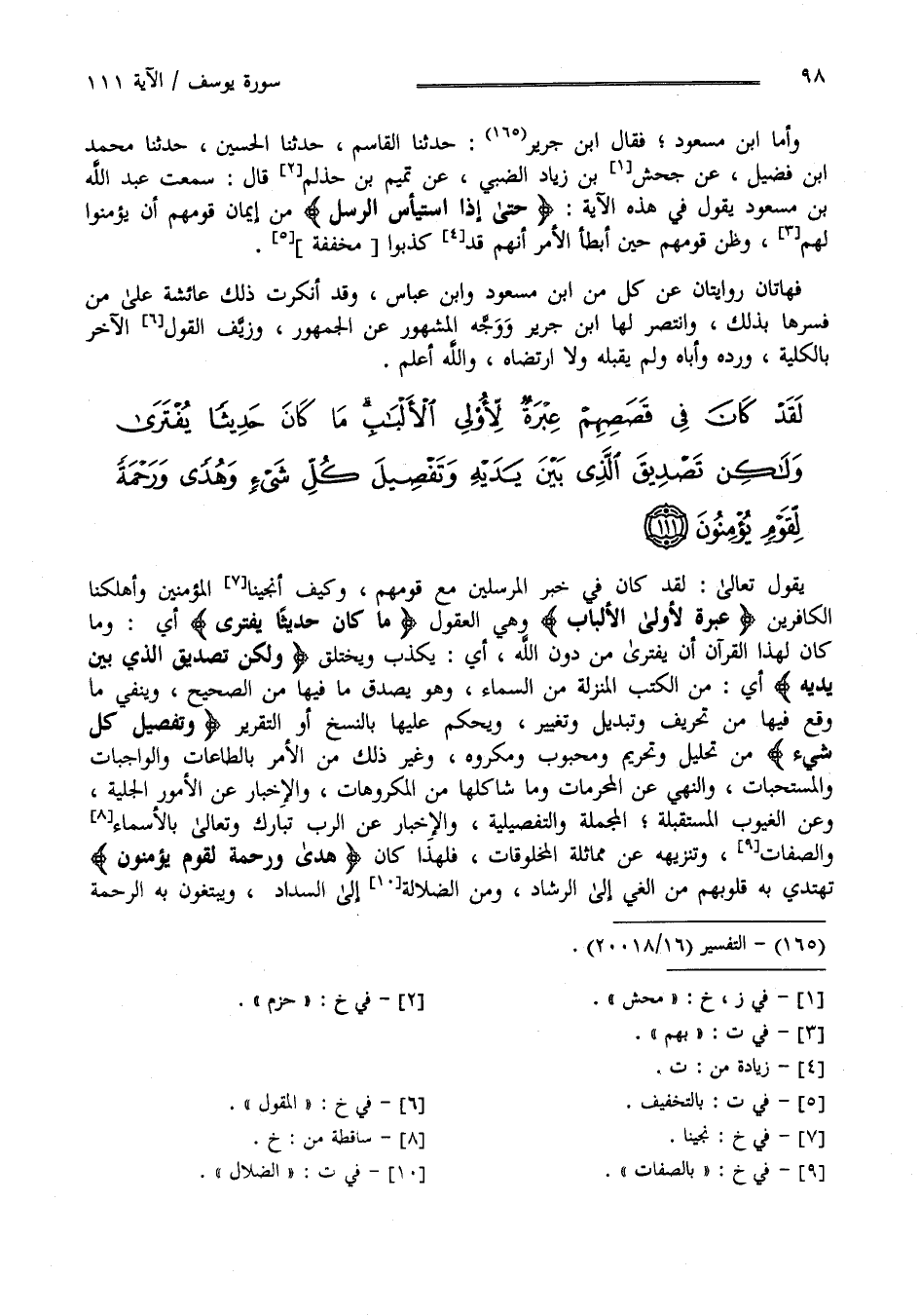 لَقَدْ كَانَ فِي قَصَصِهِمْ عِبْرَةٌ لِأُولِي الْأَلْبَابِ مَا كَانَ حَدِيثًا يُفْتَرَى وَلَكِنْ تَصْدِيقَ الَّذِي بَيْنَ يَدَيْهِ وَتَفْصِيلَ كُلِّ شَيْءٍ وَهُدًى وَرَحْمَةً لِقَوْمٍ يُؤْمِنُونَ (111)