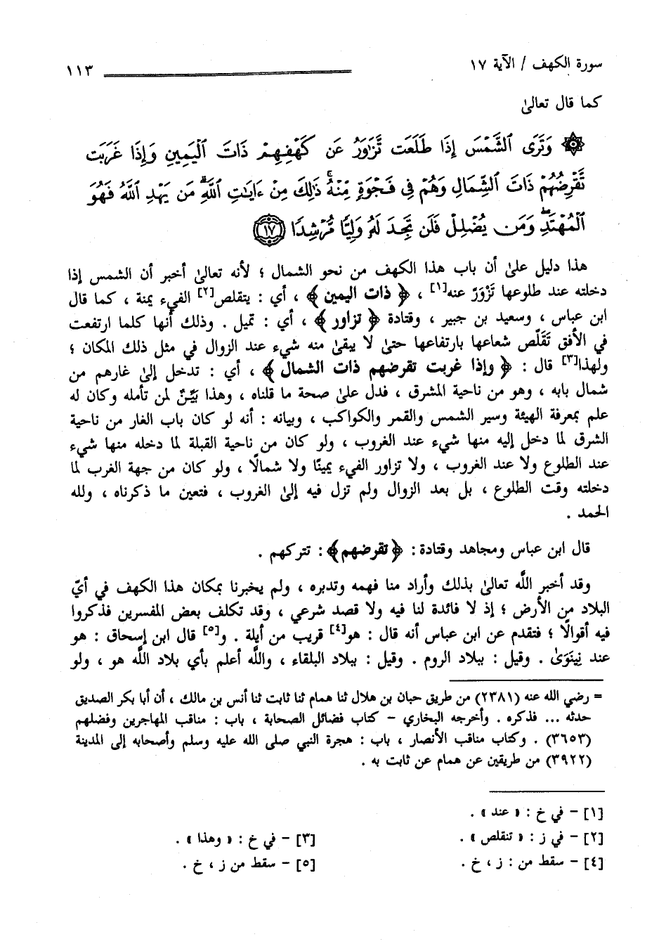 فَهَذَا فِيهِ دَلِيل عَلَى أَنَّ بَاب هَذَا الْكَهْف كَانَ مِنْ نَحْو الشَّمَال لِإِنَّهُ تَعَالَى أَخْبَرَ أَنَّ الشَّمْس إِذَا دَخَلَتْهُ عِنْد طُلُوعهَا تَزَاوَر عَنْهُ " ذَات الْيَمِين " أَيْ يَتَقَلَّص الْفَيْء يَمْنَة كَمَا قَالَ اِبْن عَبَّاس وَسَعِيد بْن جُبَيْر وَقَتَادَة " تَزَاوَر " أَيْ تَمِيل وَذَلِكَ أَنَّهَا كُلَّمَا اِرْتَفَعَتْ فِي الْأُفُق تَقَلَّصَ شُعَاعهَا بِارْتِفَاعِهَا حَتَّى لَا يَبْقَى مِنْهُ شَيْء عِنْد الزَّوَال فِي مِثْل ذَلِكَ الْمَكَان وَلِهَذَا قَالَ " وَإِذَا غَرَبَتْ تَقْرِضُهُمْ ذَات الشِّمَال " أَيْ تَدْخُل إِلَى غَارهمْ مِنْ شِمَال بَابه وَهُوَ مِنْ نَاحِيَة الْمَشْرِق فَدَلَّ عَلَى صِحَّة مَا قُلْنَاهُ وَهَذَا بَيِّن لِمَنْ تَأَمَّلَهُ وَكَانَ لَهُ عِلْم بِمَعْرِفَةِ الْهَيْئَة وَسَيْر الشَّمْس وَالْقَمَر وَالْكَوَاكِب وَبَيَانه أَنَّهُ لَوْ كَانَ بَاب الْغَار مِنْ نَاحِيَة الشَّرْق لَمَا دَخَلَ إِلَيْهِ مِنْهَا شَيْء عِنْد الْغُرُوب وَلَوْ كَانَ مِنْ نَاحِيَة الْقِبْلَة لَمَا دَخَلَ مِنْهَا شَيْء عِنْد الطُّلُوع وَلَا عِنْد الْغُرُوب وَلَا تَزَاوَر الْفَيْء يَمِينًا وَلَا شِمَالًا وَلَوْ كَانَ مِنْ جِهَة الْغَرْب لَمَا دَخَلَتْهُ وَقْت الطُّلُوع بَلْ بَعْد الزَّوَال وَلَمْ تَزَلْ فِيهِ إِلَى الْغُرُوب فَتَعَيَّنَ مَا ذَكَرْنَاهُ وَلِلَّهِ الْحَمْد وَقَالَ اِبْن عَبَّاس وَمُجَاهِد وَقَتَادَة : " تَقْرِضُهُمْ " تَتْرُكهُمْ وَقَدْ أَخْبَرَ اللَّه تَعَالَى بِذَلِكَ وَأَرَادَ مِنَّا فَهْمه وَتَدَبُّره وَلَمْ يُخْبِرنَا بِمَكَانِ هَذَا الْكَهْف فِي أَيّ الْبِلَاد مِنْ الْأَرْض إِذْ لَا فَائِدَة لَنَا فِيهِ وَلَا قَصْد شَرْعِيّ وَقَدْ تَكَلَّفَ بَعْض الْمُفَسِّرِينَ فَذَكَرُوا فِيهِ أَقْوَالًا فَتَقَدَّمَ عَنْ اِبْن عَبَّاس أَنَّهُ قَالَ هُوَ قَرِيب مِنْ أَيْلَة وَقَالَ اِبْن إِسْحَاق : هُوَ عِنْد نِينَوَى وَقِيلَ بِبِلَادِ الرُّوم وَقِيلَ بِبِلَادِ الْبَلْقَاء وَاَللَّه أَعْلَم بِأَيِّ بِلَاد اللَّه هُوَ ; وَلَوْ