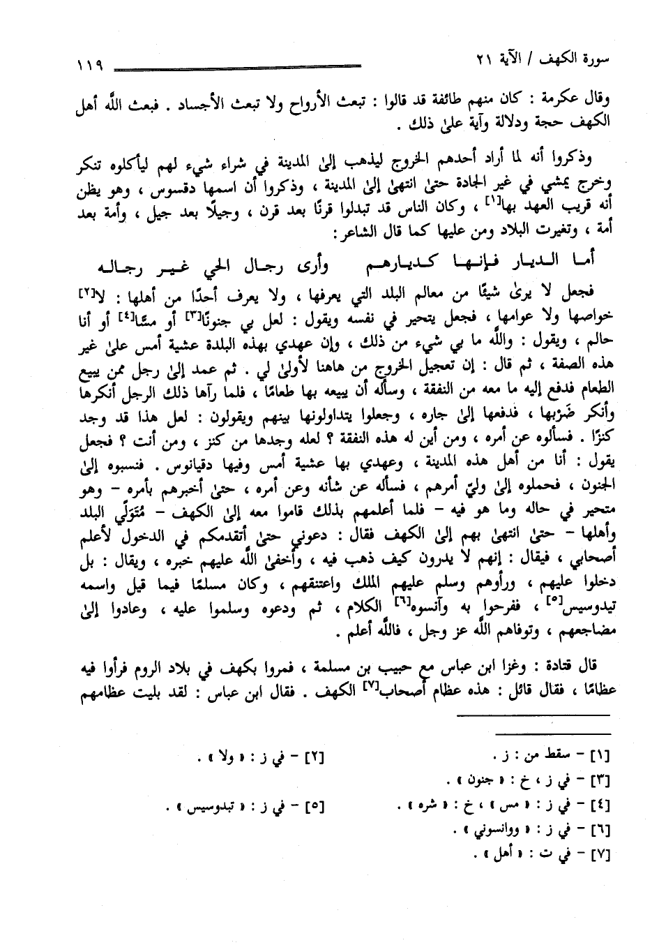 فَجَعَلَ لَا يَرَى شَيْئًا مِنْ مَعَالِم الْبَلَد الَّتِي يَعْرِفهَا وَلَا يَعْرِف أَحَدًا مِنْ أَهْلهَا لَا خَوَاصّهَا وَلَا عَوَامّهَا فَجَعَلَ يَتَحَيَّر فِي نَفْسه وَيَقُول : لَعَلَّ بِي جُنُونًا أَوْ مَسًّا أَوْ أَنَا حَالِم وَيَقُول : وَاَللَّه مَا بِي شَيْء مِنْ ذَلِكَ وَإِنَّ عَهْدِي بِهَذِهِ الْبَلْدَة عَشِيَّة أَمْس عَلَى غَيْر هَذِهِ الصِّفَة ثُمَّ قَالَ : إِنَّ تَعْجِيل الْخُرُوج مِنْ هَاهُنَا لَأَوْلَى لِي ثُمَّ عَمَدَ إِلَى رَجُل مِمَّنْ يَبِيع الطَّعَام فَدَفَعَ إِلَيْهِ مَا مَعَهُ مِنْ النَّفَقَة وَسَأَلَهُ أَنْ يَبِيعهُ بِهَا طَعَامًا فَلَمَّا رَآهَا ذَلِكَ الرَّجُل أَنْكَرَهَا وَأَنْكَرَ ضَرْبهَا فَدَفَعَهَا إِلَى جَاره وَجَعَلُوا يَتَدَاوَلُونَهَا بَيْنهمْ وَيَقُولُونَ لَعَلَّ هَذَا وَجَدَ كَنْزًا فَسَأَلُوهُ عَنْ أَمْره وَمِنْ أَيْنَ لَهُ هَذِهِ النَّفَقَة لَعَلَّهُ وَجَدَهَا مِنْ كَنْز وَمِمَّنْ أَنْتَ ؟ فَجَعَلَ يَقُول أَنَا مِنْ أَهْل هَذِهِ الْبَلْدَة وَعَهْدِي بِهَا عَشِيَّة أَمْس وَفِيهَا دِقْيَانُوس فَنَسَبُوهُ إِلَى الْجُنُون فَحَمَلُوهُ إِلَى وَلِيّ أَمْرهمْ فَسَأَلَهُ عَنْ شَأْنه وَخَبَره حَتَّى أَخْبَرَهُمْ بِأَمْرِهِ وَهُوَ مُتَحَيِّر فِي حَاله وَمَا هُوَ فِيهِ فَلَمَّا أَعْلَمَهُمْ بِذَلِكَ قَامُوا مَعَهُ إِلَى الْكَهْف - مَلِك الْبَلَد وَأَهْلهَا - حَتَّى اِنْتَهَى بِهِمْ إِلَى الْكَهْف فَقَالَ لَهُمْ : دَعُونِي حَتَّى أَتَقَدَّمكُمْ فِي الدُّخُول لِأُعْلِم أَصْحَابِي فَدَخَلَ فَيُقَال إِنَّهُمْ لَا يَدْرُونَ كَيْف ذَهَبَ فِيهِ وَأَخْفَى اللَّه عَلَيْهِمْ خَبَرهمْ وَيُقَال بَلْ دَخَلُوا عَلَيْهِمْ وَرَأَوْهُمْ وَسَلَّمَ عَلَيْهِمْ الْمَلِك وَاعْتَنَقَهُمْ وَكَانَ مُسْلِمًا فِيمَا قِيلَ وَاسْمه يندوسيس فَفَرِحُوا بِهِ وَآنَسُوهُ بِالْكَلَامِ ثُمَّ وَدَّعُوهُ وَسَلَّمُوا عَلَيْهِ وَعَادُوا إِلَى مَضَاجِعهمْ وَتَوَفَّاهُمْ اللَّه عَزَّ وَجَلَّ فَاَللَّه أَعْلَم .