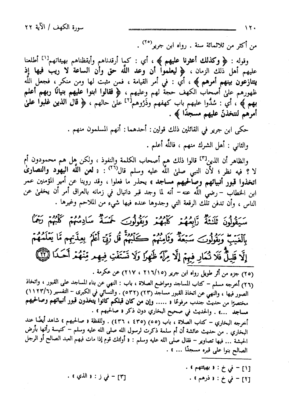مِنْ أَكْثَر مِنْ ثَلَثمِائَةِ سَنَة رَوَاهُ اِبْن جَرِير وَقَوْله " وَكَذَلِكَ أَعْثَرْنَا عَلَيْهِمْ " أَيْ كَمَا أَرْقَدْنَاهُمْ وَأَيْقَظْنَاهُمْ بِهَيْئَاتِهِمْ أَطْلَعْنَا عَلَيْهِمْ أَهْل ذَلِكَ الزَّمَان " لِيَعْلَمُوا أَنَّ وَعْد اللَّه حَقّ وَأَنَّ السَّاعَة لَا رَيْب فِيهَا إِذْ يَتَنَازَعُونَ بَيْنهمْ أَمْرهمْ " أَيْ فِي أَمْر الْقِيَامَة فَمِنْ مُثْبِت لَهَا وَمِنْ مُنْكِر فَجَعَلَ اللَّه ظُهُورهمْ عَلَى أَصْحَاب الْكَهْف حُجَّة لَهُمْ وَعَلَيْهِمْ " فَقَالُوا اِبْنُوا عَلَيْهِمْ بُنْيَانًا رَبّهمْ أَعْلَم بِهِمْ " أَيْ سُدُّوا عَلَيْهِمْ بَاب كَهْفهمْ وَذَرُوهُمْ عَلَى حَالهمْ " قَالَ الَّذِينَ غَلَبُوا عَلَى أَمْرهمْ لَنَتَّخِذَنَّ عَلَيْهِمْ مَسْجِدًا " حَكَى اِبْن جَرِير فِي الْقَائِلِينَ ذَلِكَ قَوْلَيْنِ " أَحَدهمَا " إِنَّهُمْ الْمُسْلِمُونَ مِنْهُمْ " وَالثَّانِي " أَهْل الشِّرْك مِنْهُمْ فَاَللَّه أَعْلَم وَالظَّاهِر أَنَّ الَّذِينَ قَالُوا ذَلِكَ هُمْ أَصْحَاب الْكَلِمَة وَالنُّفُوذ وَلَكِنْ هَلْ هُمْ مَحْمُودُونَ أَمْ لَا ؟ فِيهِ نَظَر لِأَنَّ النَّبِيّ صَلَّى اللَّه عَلَيْهِ وَسَلَّمَ قَالَ " لَعَنَ اللَّه الْيَهُود وَالنَّصَارَى اِتَّخَذُوا قُبُور أَنْبِيَائِهِمْ وَصَالِحِيهِمْ مَسَاجِد " يُحَذِّر مَا فَعَلُوا وَقَدْ رُوِّينَا عَنْ أَمِير الْمُؤْمِنِينَ عُمَر بْن الْخَطَّاب رَضِيَ اللَّه عَنْهُ أَنَّهُ لَمَّا وَجَدَ قَبْر دَانْيَال فِي زَمَانه بِالْعِرَاقِ أَمَرَ أَنْ يُخْفَى عَنْ النَّاس وَأَنْ تُدْفَن تِلْكَ الرُّقْعَة الَّتِي وَجَدُوهَا عِنْده فِيهَا شَيْء مِنْ الْمَلَاحِم وَغَيْرهَا .