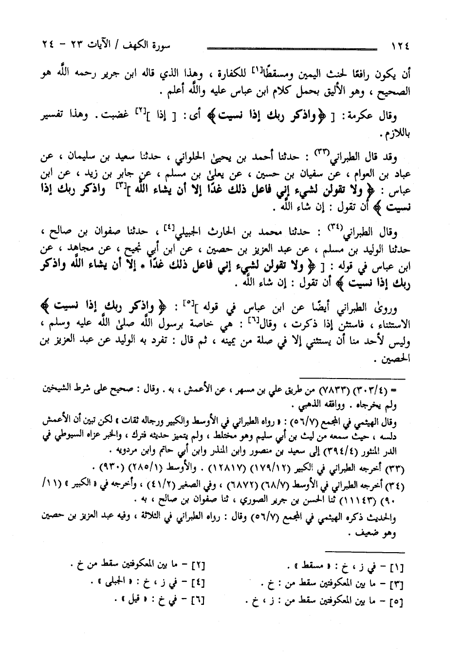 وَقَالَ عِكْرِمَة " وَاذْكُرْ رَبّك إِذَا نَسِيت " إِذَا غَضِبْت وَقَالَ الطَّبَرَانِيّ : حَدَّثَنَا مُحَمَّد بْن الْحَارِث الْجَبَلِيّ حَدَّثَنَا صَفْوَان بْن صَالِح حَدَّثَنَا الْوَلِيد بْن مُسْلِم عَنْ عَبْد الْعَزِيز بْن حُصَيْن عَنْ اِبْن أَبِي نَجِيح عَنْ مُجَاهِد عَنْ اِبْن عَبَّاس فِي قَوْله " وَلَا تَقُولَنَّ لِشَيْءٍ إِنِّي فَاعِل ذَلِكَ غَدًا إِلَّا أَنْ يَشَاء اللَّه وَاذْكُرْ رَبّك إِذَا نَسِيت " أَنْ تَقُول إِنْ شَاءَ اللَّه وَرَوَى الطَّبَرَانِيّ أَيْضًا عَنْ اِبْن عَبَّاس فِي قَوْله " وَاذْكُرْ رَبّك إِذَا نَسِيت " الِاسْتِثْنَاء فَاسْتَثْنِ إِذَا ذَكَرْت وَقَالَ هِيَ خَاصَّة بِرَسُولِ اللَّه صَلَّى اللَّه عَلَيْهِ وَسَلَّمَ وَلَيْسَ لِأَحَدٍ مِنَّا أَنْ يَسْتَثْنِي إِلَّا فِي صِلَة مِنْ يَمِينه ثُمَّ قَالَ : اِنْفَرَدَ بِهِ الْوَلِيد عَنْ عَبْد الْعَزِيز بْن الْحُصَيْن