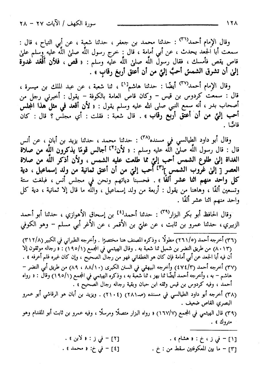 وَقَالَ الْإِمَام أَحْمَد : حَدَّثَنَا مُحَمَّد بْن جَعْفَر حَدَّثَنَا شُعْبَة عَنْ أَبِي التَّيَّاح قَالَ سَمِعْت أَبَا الْجَعْد يُحَدِّث عَنْ أَبِي أُمَامَة قَالَ : خَرَجَ رَسُول اللَّه صَلَّى اللَّه عَلَيْهِ وَسَلَّمَ عَلَى قَاصّ يَقُصّ فَأَمْسَكَ فَقَالَ رَسُول اللَّه صَلَّى اللَّه عَلَيْهِ وَسَلَّمَ قُصَّ فَلَأَنْ أَقْعُد غُدْوَة إِلَى أَنْ تُشْرِق الشَّمْس أَحَبّ إِلَيَّ مِنْ أَنْ أُعْتِق أَرْبَع رِقَاب " وَقَالَ أَحْمَد أَيْضًا : حَدَّثَنَا هَاشِم ثَنَا شُعْبَة عَنْ عَبْد الْمَلِك بْن مَيْسَرَة قَالَ سَمِعْت كُرْدُوس بْن قَيْس وَكَانَ قَاصّ الْعَامَّة بِالْكُوفَةِ يَقُول : أَخْبَرَنِي رَجُل مِنْ أَصْحَاب بَدْر أَنَّهُ سَمِعَ النَّبِيّ صَلَّى اللَّه عَلَيْهِ وَسَلَّمَ يَقُول " لَأَنْ أَقْعُد فِي مِثْل هَذَا الْمَجْلِس أَحَبّ إِلَيَّ مِنْ أَنْ أُعْتِق أَرْبَع رِقَاب " قَالَ شُعْبَة فَقُلْت أَيّ مَجْلِس قَالَ كَانَ قَاصًّا وَقَالَ أَبُو دَاوُد الطَّيَالِسِيّ فِي مُسْنَده : حَدَّثَنَا مُحَمَّد حَدَّثَنَا يَزِيد بْن أَبَان عَنْ أَنَس قَالَ : قَالَ رَسُول اللَّه صَلَّى اللَّه عَلَيْهِ وَسَلَّمَ " لَأَنْ أُجَالِس قَوْمًا يَذْكُرُونَ اللَّه مِنْ صَلَاة الْغَدَاة إِلَى طُلُوع الشَّمْس أَحَبّ إِلَيَّ مِمَّا طَلَعَتْ عَلَيْهِ الشَّمْس وَلَأَنْ أَذْكُر اللَّه مِنْ صَلَاة الْعَصْر إِلَى غُرُوب الشَّمْس أَحَبّ إِلَيَّ مِنْ أَنْ أُعْتِق ثَمَانِيَة مِنْ وَلَد إِسْمَاعِيل دِيَة كُلّ وَاحِد مِنْهُمْ اِثْنَا عَشَر أَلْفًا " فَحَسَبْنَا دِيَاتهمْ وَنَحْنُ فِي مَجْلِس أَنَس فَبَلَغَتْ سِتَّة وَتِسْعِينَ أَلْفًا وَهَاهُنَا مَنْ يَقُول أَرْبَعَة مِنْ وَلَد إِسْمَاعِيل وَاَللَّه مَا قَالَ إِلَّا ثَمَانِيَة دِيَة كُلّ وَاحِد مِنْهُمْ اِثْنَا عَشَر أَلْفًا , وَقَالَ الْحَافِظ أَبُو بَكْر الْبَزَّار : حَدَّثَنَا مُحَمَّد بْن إِسْحَاق الْأَهْوَازِيّ حَدَّثَنَا أَبُو أَحْمَد الزُّبَيْرِيّ حَدَّثَنَا عَمْرو بْن ثَابِت عَنْ عَلِيّ بْن الْأَقْمَر عَنْ الْأَغَرّ أَبِي مُسْلِم وَهُوَ الْكُوفِيّ