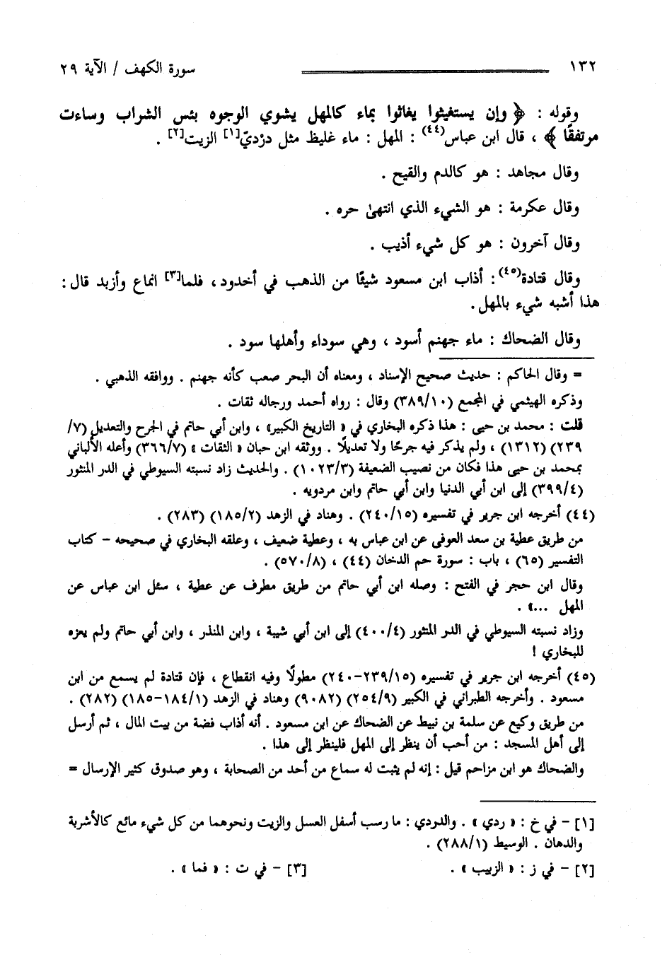 " وَقَوْله " وَإِنْ يَسْتَغِيثُوا يُغَاثُوا بِمَاءٍ كَالْمُهْلِ يَشْوِي الْوُجُوه " الْآيَة قَالَ اِبْن عَبَّاس : الْمُهْل الْمَاء الْغَلِيظ مِثْل دُرْدِيّ الزَّيْت وَقَالَ مُجَاهِد : هُوَ كَالدَّمِ وَالْقَيْح وَقَالَ عِكْرِمَة : هُوَ الشَّيْء الَّذِي اِنْتَهَى حَرّه وَقَالَ آخَرُونَ : هُوَ كُلّ شَيْء أُذِيبَ .
