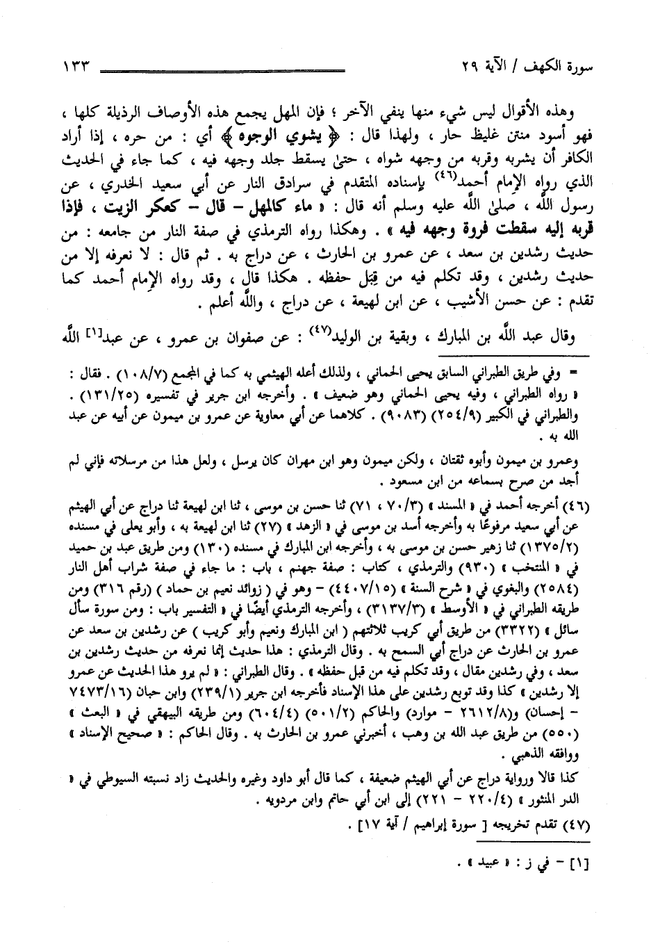 وَهَذِهِ الْأَقْوَال لَيْسَ شَيْء مِنْهَا يَنْفِي الْآخَر فَإِنَّ الْمُهْل يَجْمَع هَذِهِ الْأَوْصَاف الرَّذِيلَة كُلّهَا فَهُوَ أَسْوَد مُنْتِن غَلِيظ حَارّ وَلِهَذَا قَالَ " يَشْوِي الْوُجُوه " أَيْ مِنْ حَرّه إِذَا أَرَادَ الْكَافِر أَنْ يَشْرَبهُ وَقَرَّبَهُ مِنْ وَجْهه شَوَاهُ حَتَّى تَسْقُط جِلْدَة وَجْهه فِيهِ كَمَا جَاءَ فِي الْحَدِيث الَّذِي رَوَاهُ الْإِمَام أَحْمَد بِإِسْنَادِهِ الْمُتَقَدِّم فِي سُرَادِق النَّار عَنْ أَبِي سَعِيد الْخُدْرِيّ عَنْ رَسُول اللَّه صَلَّى اللَّه عَلَيْهِ وَسَلَّمَ أَنَّهُ قَالَ " مَاء كَالْمُهْلِ " قَالَ كَعَكَرِ الزَّيْت فَإِذَا قَرَّبَهُ إِلَيْهِ سَقَطَتْ فَرْوَة وَجْهه فِيهِ وَهَكَذَا رَوَاهُ التِّرْمِذِيّ فِي صِفَة النَّار مِنْ جَامِعه مِنْ حَدِيث رَشْدِين بْن سَعْد عَنْ عَمْرو بْن الْحَارِث عَنْ دَرَّاج بِهِ ثُمَّ قَالَ : لَا نَعْرِفهُ إِلَّا مِنْ حَدِيث رَشْدِين وَقَدْ تُكُلِّمَ فِيهِ مِنْ قِبَل حِفْظه هَكَذَا قَالَ , وَقَدْ رَوَاهُ الْإِمَام أَحْمَد كَمَا تَقَدَّمَ عَنْ حَسَن الْأَشْيَب عَنْ اِبْن لَهِيعَة عَنْ دَرَّاج وَاَللَّه أَعْلَم .