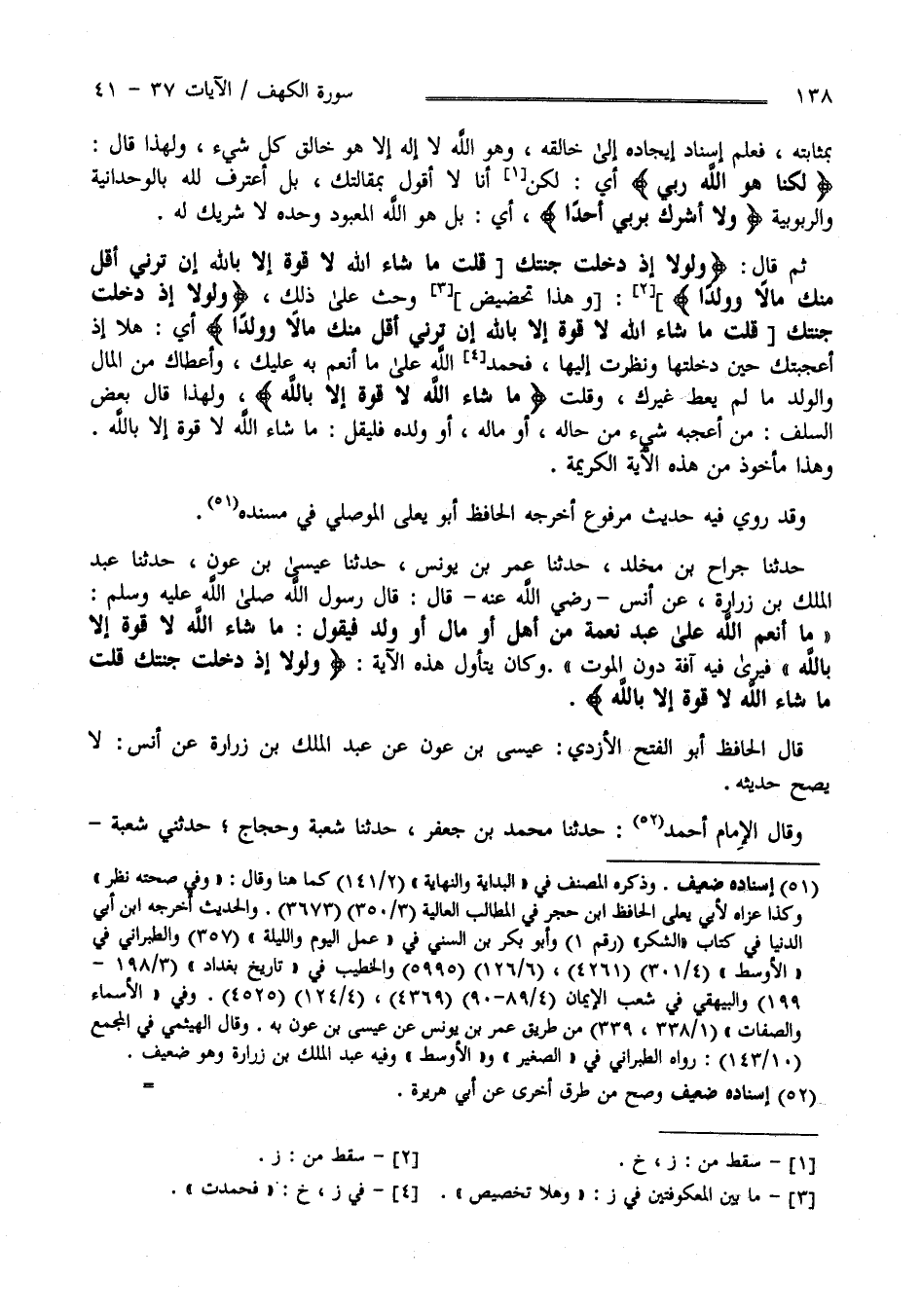 ثُمَّ قَالَ " وَلَوْلَا إِذْ دَخَلْت جَنَّتك قُلْت مَا شَاءَ اللَّه لَا قُوَّة إِلَّا بِاَللَّهِ إِنْ تَرَنِ أَنَا أَقَلّ مِنْك مَالًا وَوَلَدًا " هَذَا تَحْضِيض وَحَثّ عَلَى ذَلِكَ أَيْ هَلَّا إِذَا أَعْجَبَتْك حِين دَخَلْتهَا وَنَظَرْت إِلَيْهَا حَمِدْت اللَّه عَلَى مَا أَنْعَمَ بِهِ عَلَيْك وَأَعْطَاك مِنْ الْمَال أَوْ الْوَلَد مَا لَمْ يُعْطَهُ غَيْرك وَقُلْت مَا شَاءَ اللَّه لَا قُوَّة إِلَّا بِاَللَّهِ وَلِهَذَا قَالَ بَعْض السَّلَف : مَنْ أَعْجَبَهُ شَيْء مِنْ حَاله أَوْ مَاله أَوْ وَلَده فَلْيَقُلْ مَا شَاءَ اللَّه لَا قُوَّة إِلَّا بِاَللَّهِ وَهَذَا مَأْخُوذ مِنْ هَذِهِ الْآيَة الْكَرِيمَة وَقَدْ رُوِيَ فِيهِ حَدِيث مَرْفُوع أَخْرَجَهُ الْحَافِظ أَبُو يَعْلَى الْمَوْصِلِيّ فِي مُسْنَده حَدَّثَنَا جَرَّاح بْن مَخْلَد حَدَّثَنَا عُمَر بْن يُونُس حَدَّثَنَا عِيسَى بْن عَوْن حَدَّثَنَا عَبْد الْمَلِك بْن زُرَارَة عَنْ أَنَس رَضِيَ اللَّه عَنْهُ قَالَ : قَالَ رَسُول اللَّه صَلَّى اللَّه عَلَيْهِ وَسَلَّمَ " مَا أَنْعَمَ اللَّه عَلَى عَبْد نِعْمَة مِنْ أَهْل أَوْ مَال أَوْ وَلَد فَيَقُول مَا شَاءَ اللَّه لَا قُوَّة إِلَّا بِاَللَّهِ فَيُرَى فِيهِ آفَة دُون الْمَوْت " وَكَانَ يَتَأَوَّل هَذِهِ الْآيَة " وَلَوْلَا إِذْ دَخَلْت جَنَّتك قُلْت مَا شَاءَ اللَّه لَا قُوَّة إِلَّا بِاَللَّهِ " قَالَ الْحَافِظ أَبُو الْفَتْح الْأَزْدِيّ عِيسَى بْن عَوْن عَنْ عَبْد الْمَلِك بْن زُرَارَة عَنْ أَنَس لَا يَصِحّ حَدِيثه .