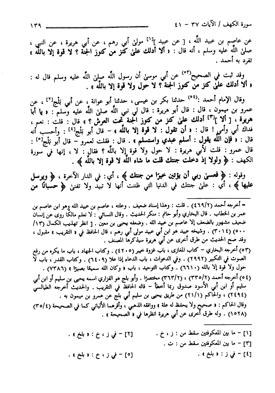 عَنْ عَاصِم بْن عُبَيْد اللَّه عَنْ عُبَيْد مَوْلَى أَبِي رُهْم عَنْ أَبِي هُرَيْرَة عَنْ النَّبِيّ صَلَّى اللَّه عَلَيْهِ وَسَلَّمَ أَنَّهُ قَالَ " أَلَا أَدُلّك عَلَى كَنْز مِنْ كُنُوز الْجَنَّة ؟ لَا حَوْل وَلَا قُوَّة إِلَّا بِاَللَّهِ " تَفَرَّدَ بِهِ أَحْمَد وَقَدْ ثَبَتَ فِي الصَّحِيح عَنْ أَبِي مُوسَى أَنَّ رَسُول اللَّه صَلَّى اللَّه عَلَيْهِ وَسَلَّمَ قَالَ لَهُ " أَلَا أَدُلّك عَلَى كَنْز مِنْ كُنُوز الْجَنَّة ؟ لَا حَوْل وَلَا قُوَّة إِلَّا بِاَللَّهِ " وَقَالَ الْإِمَام أَحْمَد : حَدَّثَنَا بُكَيْر بْن عِيسَى حَدَّثَنَا أَبُو عَوَانَة عَنْ أَبِي بَلْج عَنْ عَمْرو بْن مَيْمُون قَالَ : قَالَ أَبُو هُرَيْرَة قَالَ لِي رَسُول اللَّه صَلَّى اللَّه عَلَيْهِ وَسَلَّمَ " يَا أَبَا هُرَيْرَة أَلَا أَدُلّك عَلَى كَنْز مِنْ كُنُوز الْجَنَّة تَحْت الْعَرْش " ؟ قَالَ قُلْت فِدَاك أَبِي وَأُمِّي قَالَ " أَنْ تَقُول لَا قُوَّة إِلَّا بِاَللَّهِ " قَالَ أَبُو بَلْج وَأَحْسَب أَنَّهُ قَالَ " فَإِنَّ اللَّه يَقُول أَسْلَمَ عَبْدِي وَاسْتَسْلَمَ " قَالَ فَقُلْت لِعَمْرٍو قَالَ أَبُو بَلْج قَالَ عَمْرو قُلْت لِأَبِي هُرَيْرَة لَا حَوْل وَلَا قُوَّة إِلَّا بِاَللَّهِ فَقَالَ لَا إِنَّهَا فِي سُورَة الْكَهْف " وَلَوْلَا إِذْ دَخَلْت جَنَّتك قُلْت مَا شَاءَ اللَّه لَا قُوَّة إِلَّا بِاَللَّهِ " .