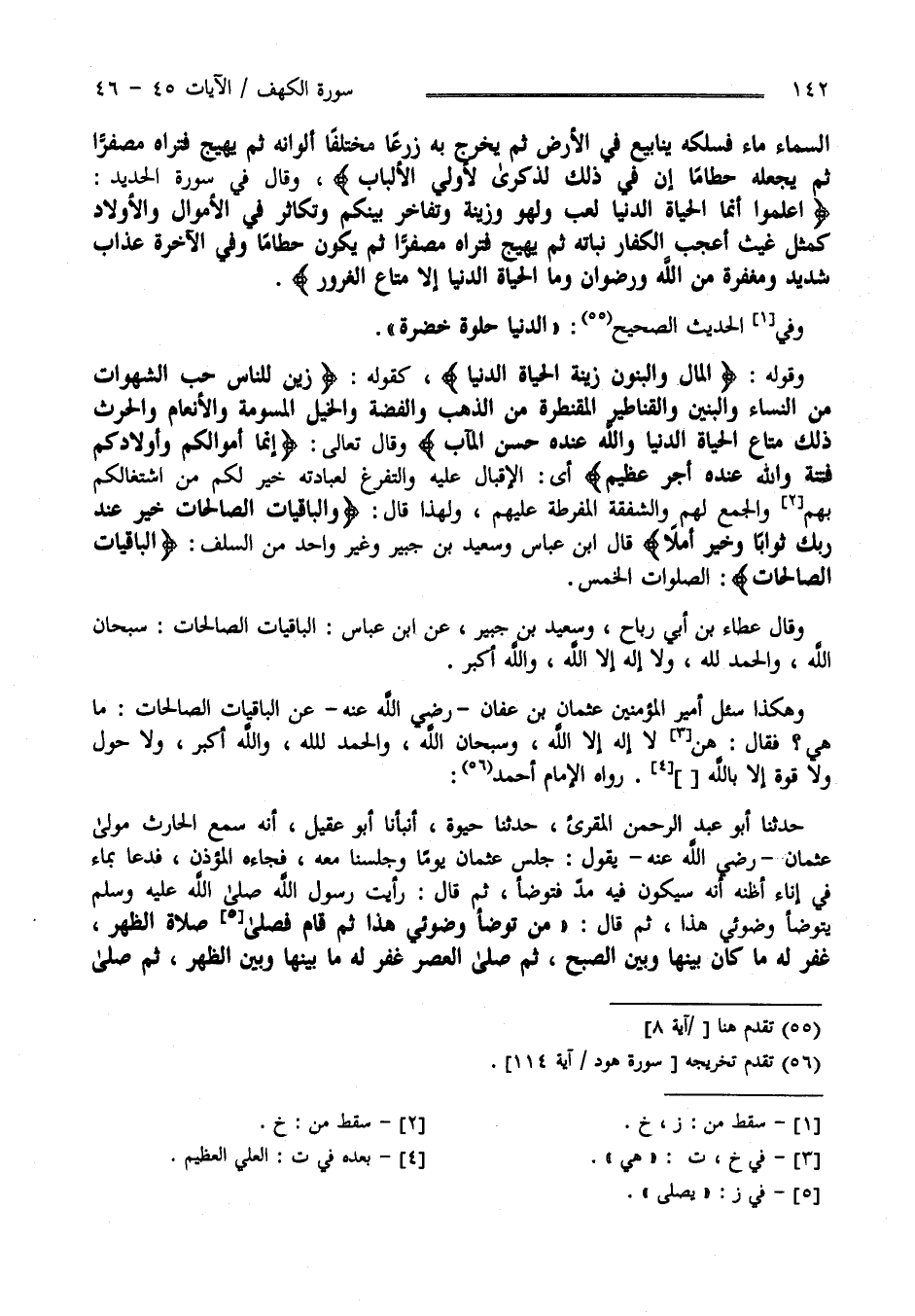 وَقَوْله : " الْمَال وَالْبَنُونَ زِينَة الْحَيَاة الدُّنْيَا " كَقَوْلِهِ : زُيِّنَ لِلنَّاسِ حُبّ الشَّهَوَات مِنْ النِّسَاء وَالْبَنِينَ وَالْقَنَاطِير الْمُقَنْطَرَة مِنْ الذَّهَب الْآيَة وَقَالَ تَعَالَى : " إِنَّمَا أَمْوَالكُمْ وَأَوْلَادكُمْ فِتْنَة وَاَللَّه عِنْده أَجْر عَظِيم " أَيْ الْإِقْبَال عَلَيْهِ وَالتَّفَرُّغ لِعِبَادَتِهِ خَيْر لَكُمْ مِنْ اِشْتِغَالكُمْ بِهِمْ وَالْجَمْع لَهُمْ وَالشَّفَقَة الْمُفْرِطَة عَلَيْهِمْ وَلِهَذَا قَالَ " وَالْبَاقِيَات الصَّالِحَات خَيْر عِنْد رَبّك ثَوَابًا وَخَيْر أَمَلًا " قَالَ اِبْن عَبَّاس وَسَعِيد بْن جُبَيْر وَغَيْر وَاحِد مِنْ السَّلَف : الْبَاقِيَات الصَّالِحَات الصَّلَوَات الْخَمْس وَقَالَ عَطَاء بْن أَبِي رَبَاح وَسَعِيد بْن جُبَيْر عَنْ اِبْن عَبَّاس : الْبَاقِيَات الصَّالِحَات سُبْحَان اللَّه وَالْحَمْد لِلَّهِ وَلَا إِلَه إِلَّا اللَّه وَاَللَّه أَكْبَر وَهَكَذَا سُئِلَ أَمِير الْمُؤْمِنِينَ عُثْمَان بْن عَفَّان عَنْ الْبَاقِيَات الصَّالِحَات مَا هِيَ ؟ فَقَالَ : هِيَ لَا إِلَه إِلَّا اللَّه وَسُبْحَان اللَّه وَالْحَمْد لِلَّهِ وَاَللَّه أَكْبَر وَلَا حَوْل وَلَا قُوَّة إِلَّا بِاَللَّهِ الْعَلِيّ الْعَظِيم .