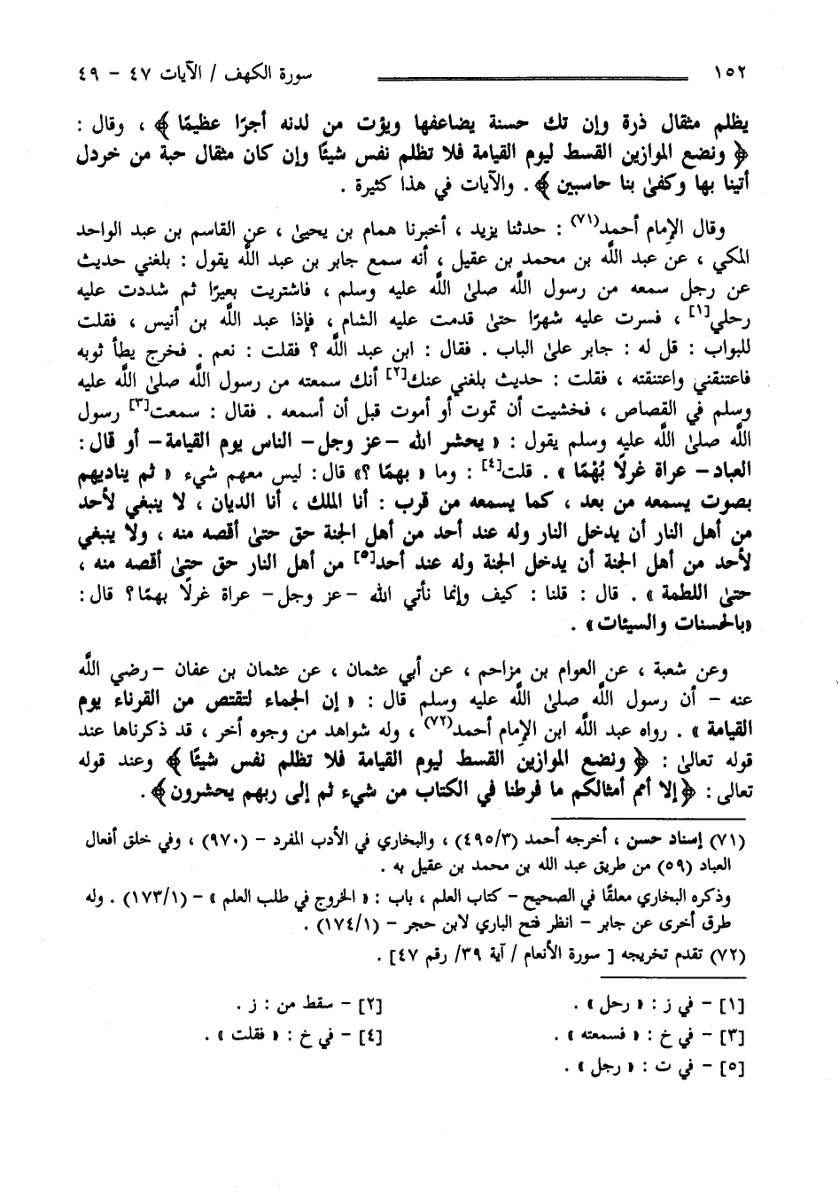 يَظْلِم مِثْقَال ذَرَّة وَإِنْ تَكُ حَسَنَة يُضَاعِفهَا " الْآيَة وَقَالَ " وَنَضَع الْمَوَازِين الْقِسْط لِيَوْمِ الْقِيَامَة فَلَا تُظْلَم نَفْس شَيْئًا - إِلَى قَوْله - حَاسِبِينَ " وَالْآيَات فِي هَذَا كَثِيرَة وَقَالَ الْإِمَام أَحْمَد : حَدَّثَنَا يَزِيد أَخْبَرَنَا هَمَّام بْن يَحْيَى عَنْ الْقَاسِم بْن عَبْد الْوَاحِد الْمَكِّيّ عَنْ عَبْد اللَّه بْن مُحَمَّد بْن عُقَيْل أَنَّهُ سَمِعَ جَابِر بْن عَبْد اللَّه يَقُول : بَلَغَنِي حَدِيث عَنْ رَجُل سَمِعَهُ مِنْ النَّبِيّ صَلَّى اللَّه عَلَيْهِ وَسَلَّمَ فَاشْتَرَيْت بَعِيرًا ثُمَّ شَدَدْت عَلَيْهِ رَحْلًا فَسِرْت عَلَيْهِ شَهْرًا حَتَّى قَدِمْت عَلَيْهِ الشَّام فَإِذَا عَبْد اللَّه بْن أُنَيْس فَقُلْت لِلْبَوَّابِ قُلْ لَهُ جَابِر عَلَى الْبَاب فَقَالَ اِبْن عَبْد اللَّه : قُلْت نَعَمْ فَخَرَجَ يَطَأ ثَوْبه فَاعْتَنَقَنِي وَاعْتَنَقْته فَقُلْت حَدِيث بَلَغَنِي عَنْك أَنَّك سَمِعْته مِنْ رَسُول اللَّه صَلَّى اللَّه عَلَيْهِ وَسَلَّمَ فِي الْقِصَاص فَخَشِيت أَنْ تَمُوت أَوْ أَمُوت قَبْل أَنْ أَسْمَعهُ فَقَالَ سَمِعْت رَسُول اللَّه صَلَّى اللَّه عَلَيْهِ وَسَلَّمَ يَقُول " يَحْشُر اللَّه عَزَّ وَجَلَّ النَّاس يَوْم الْقِيَامَة - أَوْ قَالَ الْعِبَاد - عُرَاة غُرْلًا بُهْمًا " قُلْت وَمَا بُهْمًا ؟ قَالَ " لَيْسَ مَعَهُمْ شَيْء ثُمَّ يُنَادِيهِمْ بِصَوْتٍ يَسْمَعهُ مَنْ بَعُدَ كَمَا يَسْمَعهُ مَنْ قَرُبَ : أَنَا الْمَلِك أَنَا الدَّيَّان لَا يَنْبَغِي لِأَحَدٍ مِنْ أَهْل النَّار أَنْ يَدْخُل النَّار وَلَهُ عِنْد أَحَد مِنْ أَهْل الْجَنَّة حَقّ حَتَّى أَقْضِيه مِنْهُ وَلَا يَنْبَغِي لِأَحَدٍ مِنْ أَهْل الْجَنَّة أَنْ يَدْخُل الْجَنَّة وَلَهُ عِنْد رَجُل مِنْ أَهْل النَّار حَقّ حَتَّى أَقْضِيه مِنْهُ حَتَّى اللَّطْمَة قَالَ : قُلْنَا كَيْف وَإِنَّمَا نَأْتِي اللَّه عَزَّ وَجَلَّ حُفَاة عُرَاة غُرْلًا بُهْمًا ؟ قَالَ " بِالْحَسَنَاتِ وَالسَّيِّئَات " وَعَنْ شُعْبَة عَنْ الْعَوَّام بْن مُزَاحِم عَنْ أَبِي عُثْمَان عَنْ عُثْمَان بْن عَفَّان رَضِيَ اللَّه عَنْهُ أَنَّ رَسُول اللَّه صَلَّى