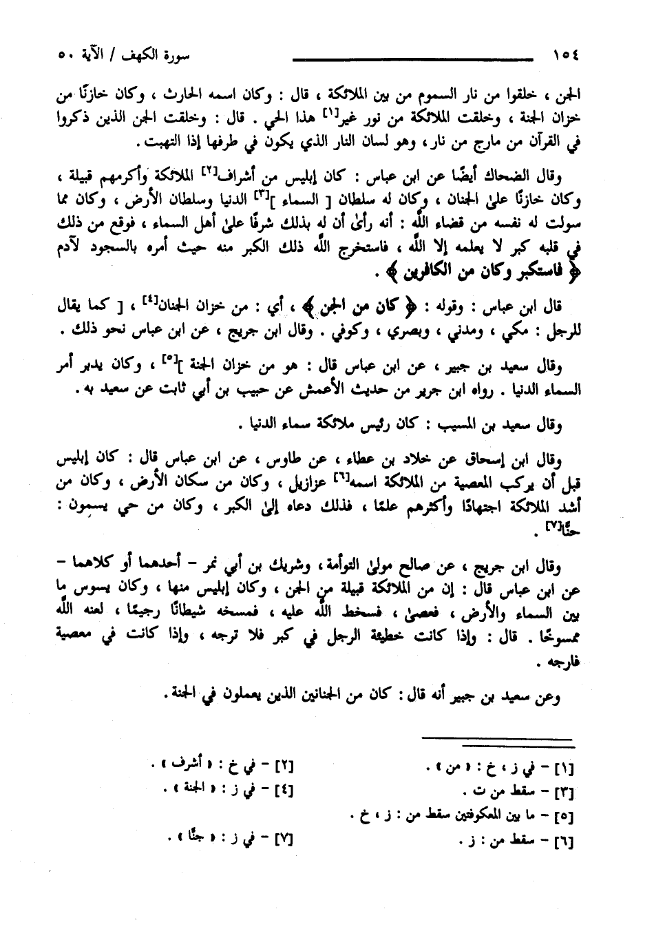 الْجِنّ خُلِقُوا مِنْ نَار السَّمُوم مِنْ بَيْن الْمَلَائِكَة وَكَانَ اِسْمه الْحَارِث وَكَانَ خَازِنًا مِنْ خُزَّانِ الْجَنَّة وَخُلِقَتْ الْمَلَائِكَة مِنْ نُور غَيْر هَذَا الْحَيّ قَالَ : وَخُلِقَتْ الْجِنّ الَّذِينَ ذُكِرُوا فِي الْقُرْآن مِنْ مَارِج مِنْ نَار وَهُوَ لِسَان النَّار الَّذِي يَكُون فِي طَرَفهَا إِذَا اِلْتَهَبَتْ وَقَالَ الضَّحَّاك أَيْضًا عَنْ اِبْن عَبَّاس : كَانَ إِبْلِيس مِنْ أَشْرَف الْمَلَائِكَة وَأَكْرَمهمْ قَبِيلَة وَكَانَ خَازِنًا عَلَى الْجِنَان وَكَانَ لَهُ سُلْطَان السَّمَاء الدُّنْيَا وَسُلْطَان الْأَرْض وَكَانَ مِمَّا سَوَّلَتْ لَهُ نَفْسه مِنْ قَضَاء اللَّه أَنَّهُ رَأَى أَنَّ لَهُ بِذَلِكَ شَرَفًا عَلَى أَهْل السَّمَاء فَوَقَعَ مِنْ ذَلِكَ فِي قَلْبه كِبْر لَا يَعْلَمهُ إِلَّا اللَّه وَاسْتَخْرَجَ اللَّه ذَلِكَ الْكِبْر مِنْهُ حِين أَمَرَهُ بِالسُّجُودِ لِآدَم " فَاسْتَكْبَرَ وَكَانَ مِنْ الْكَافِرِينَ " قَالَ اِبْن عَبَّاس قَوْله " كَانَ مِنْ الْجِنّ " أَيْ مِنْ خُزَّانِ الْجِنَان كَمَا يُقَال لِلرَّجُلِ مَكِّيّ وَمَدَنِيّ وَبَصْرِيّ وَكُوفِيّ وَقَالَ اِبْن جُرَيْج عَنْ اِبْن عَبَّاس نَحْو ذَلِكَ وَقَالَ سَعِيد بْن جُبَيْر عَنْ اِبْن عَبَّاس قَالَ : هُوَ مِنْ خُزَّانِ الْجَنَّة وَكَانَ يُدَبِّر أَمْر السَّمَاء الدُّنْيَا