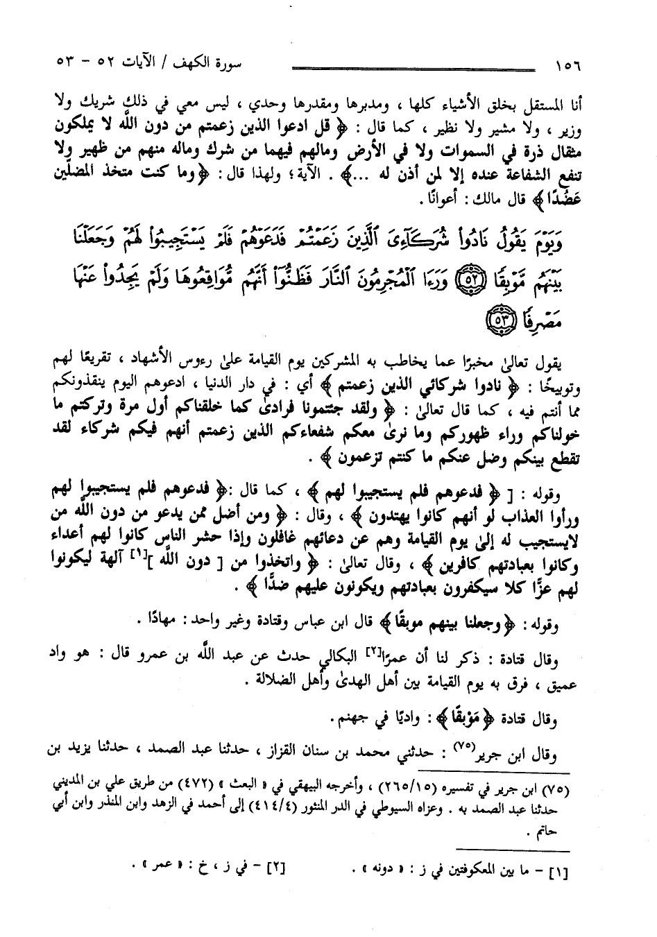 يَقُول تَعَالَى مُخْبِرًا عَمَّا يُخَاطِب بِهِ الْمُشْرِكِينَ يَوْم الْقِيَامَة عَلَى رُءُوس الْأَشْهَاد تَقْرِيعًا لَهُمْ وَتَوْبِيخًا " نَادُوا شُرَكَائِيَ الَّذِينَ زَعَمْتُمْ " أَيْ فِي دَار الدُّنْيَا اُدْعُوهُمْ الْيَوْم يُنْقِذُونَكُمْ مِمَّا أَنْتُمْ فِيهِ كَمَا قَالَ تَعَالَى " وَلَقَدْ جِئْتُمُونَا فُرَادَى كَمَا خَلَقْنَاكُمْ أَوَّل مَرَّة وَتَرَكْتُمْ مَا خَوَّلْنَاكُمْ وَرَاء ظُهُوركُمْ وَمَا نَرَى مَعَكُمْ شُفَعَاءَكُمْ الَّذِينَ زَعَمْتُمْ أَنَّهُمْ فِيكُمْ شُرَكَاء لَقَدْ تَقَطَّعَ بَيْنكُمْ وَضَلَّ عَنْكُمْ مَا كُنْتُمْ تَزْعُمُونَ " وَقَوْله " فَدَعَوْهُمْ فَلَمْ يَسْتَجِيبُوا لَهُمْ " كَمَا قَالَ " وَقِيلَ اُدْعُوا شُرَكَاءَكُمْ فَدَعَوْهُمْ فَلَمْ يَسْتَجِيبُوا لَهُمْ " الْآيَة وَقَالَ " وَمَنْ أَضَلّ مِمَّنْ يَدْعُو مِنْ دُون اللَّه مَنْ لَا يَسْتَجِيب لَهُ " الْآيَتَيْنِ وَقَالَ تَعَالَى " وَاِتَّخَذُوا مِنْ دُون اللَّه آلِهَة لِيَكُونُوا لَهُمْ عِزًّا كَلَّا سَيَكْفُرُونَ بِعِبَادَتِهِمْ وَيَكُونُونَ عَلَيْهِمْ ضِدًّا " وَقَوْله " وَجَعَلْنَا بَيْنهمْ مَوْبِقًا " قَالَ اِبْن عَبَّاس وَقَتَادَة وَغَيْر وَاحِد مَهْلَكًا وَقَالَ قَتَادَة : ذُكِرَ لَنَا أَنَّ عَمْرًا الْبِكَالِيّ حَدَّثَ عَنْ عَبْد اللَّه بْن عَمْرو قَالَ : هُوَ وَادٍ عَمِيق فُرِّقَ بِهِ يَوْم الْقِيَامَة بَيْن أَهْل الْهُدَى وَأَهْل الضَّلَالَة وَقَالَ قَتَادَة : مَوْبِقًا وَادِيًا فِي جَهَنَّم .